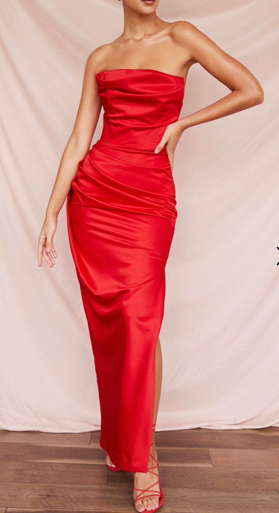 'Adrienne' embodies feminine tones and features sexy, languid drapes. Constructed with our premium weighty and lustrous duchess satin, it gracefully drapes over the bust and accentuates the waist. Designed with strategically placed boning for optimal fit and support, the bodice also boasts a balcony shape and special side boob boning for the perfect uplift and cleavage. To prevent slipping, the bodice is lined with a textured crepe.