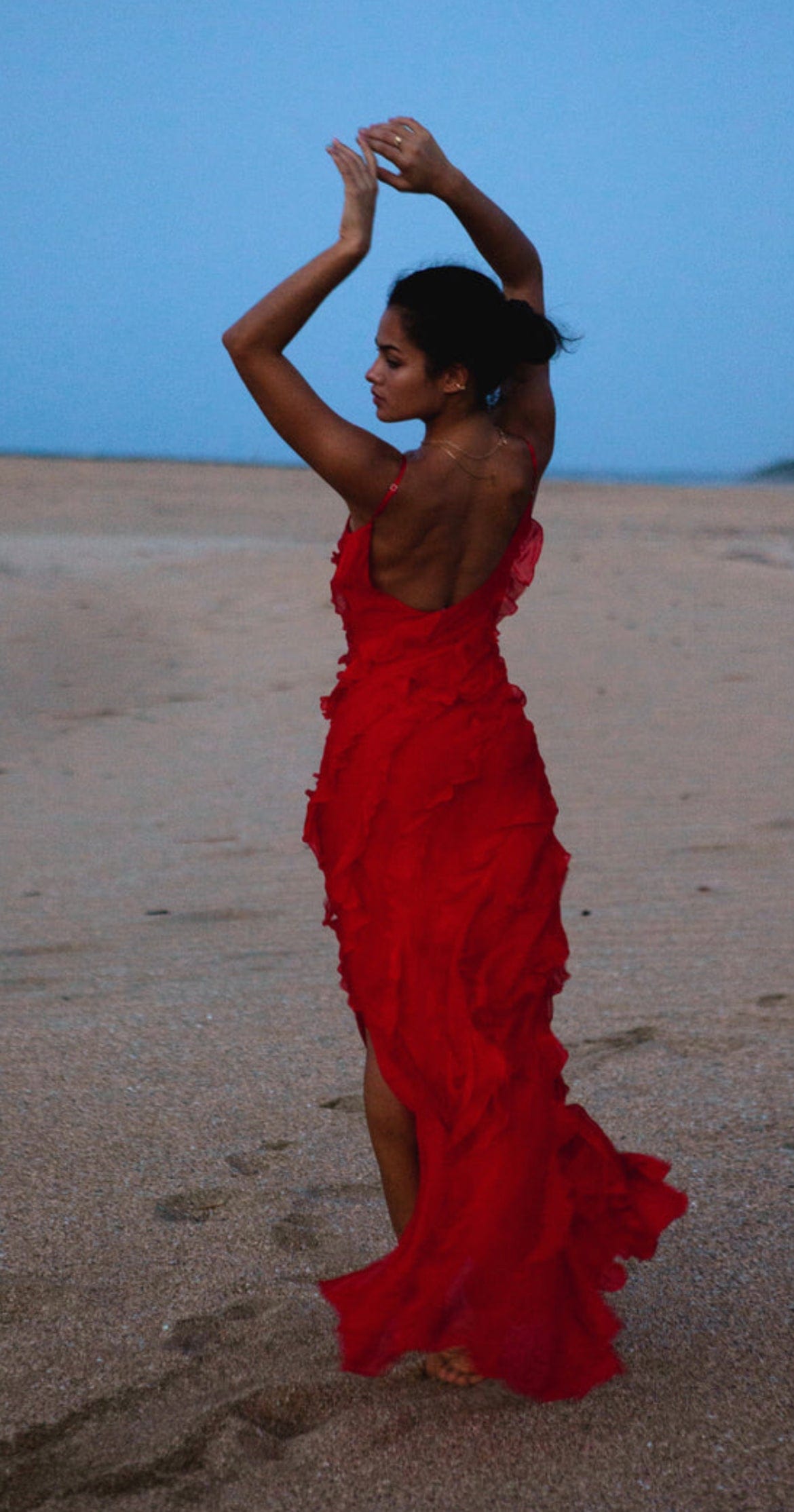 Crafted in a floaty chiffon in a bright scarlet hue; and hitting the sweet spot between elegant and sexy, this eye catcher of a dress will ensure you steal the show all day and night.