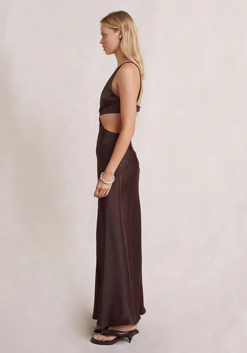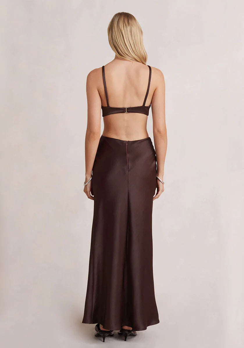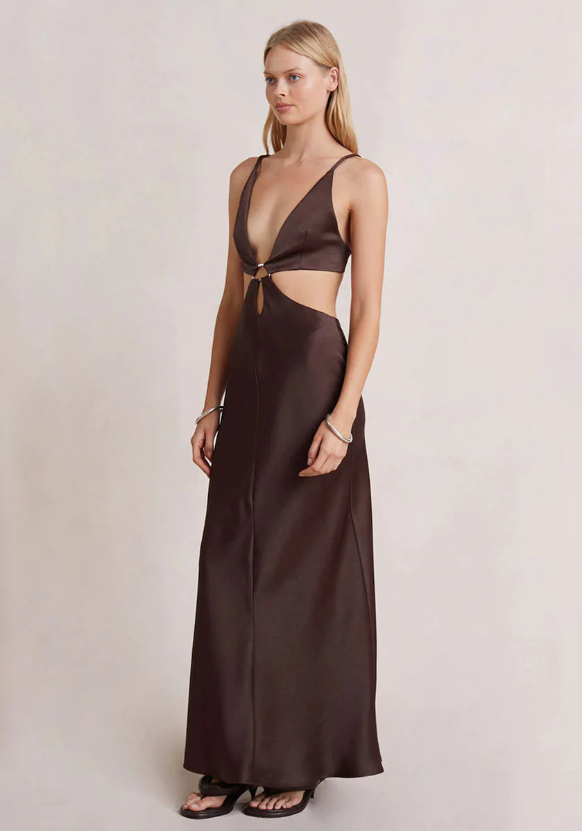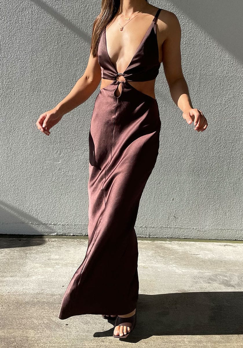 A show stopping event wear style, the Felix V Maxi Dress is cut from a lustrous satin fabric that skims the body and falls into a maxi-length skirt. The alluring dress features a plunging V-neckline, accented by silver D-ring hardware with under bust cut-outs that lead to an open back.