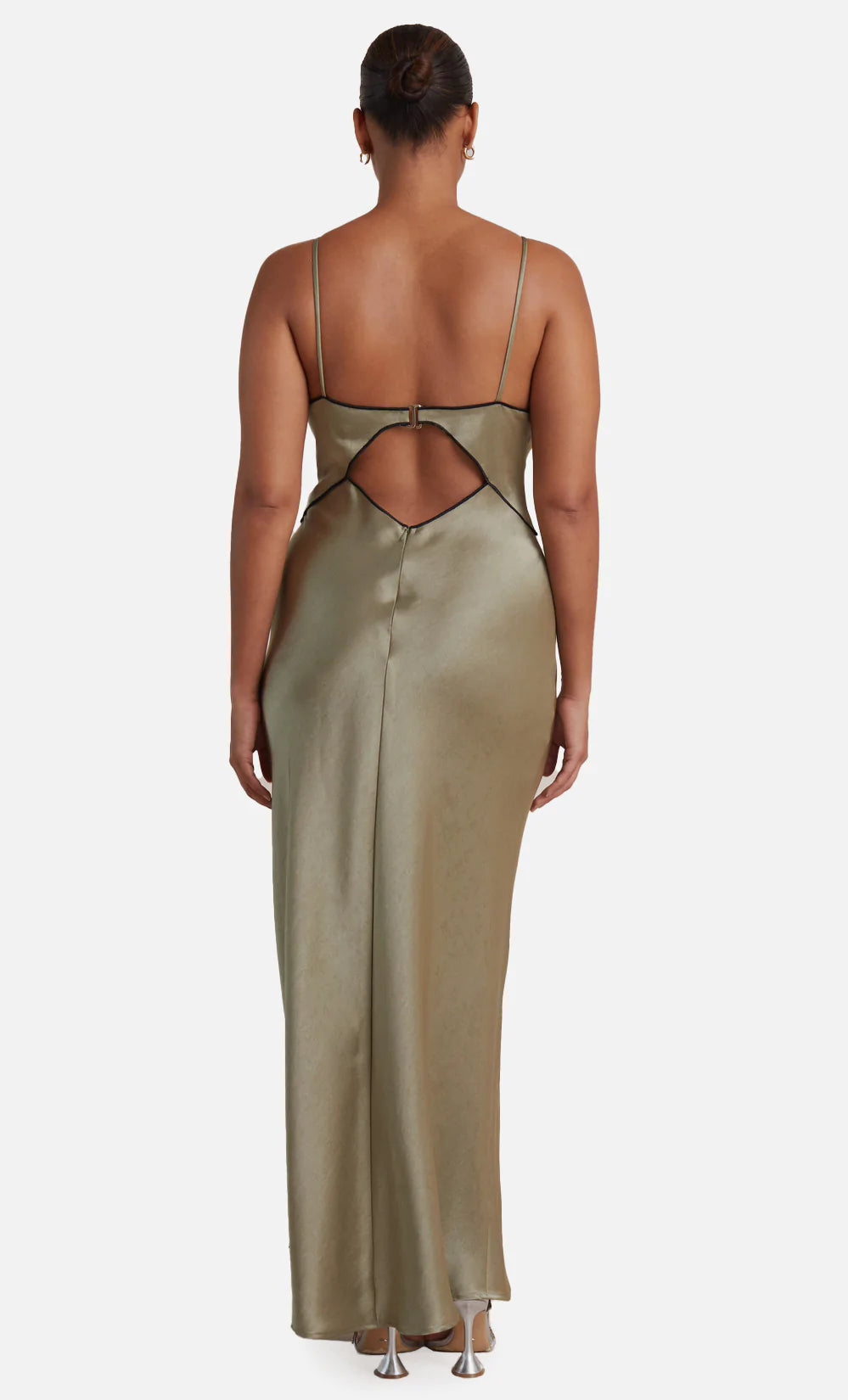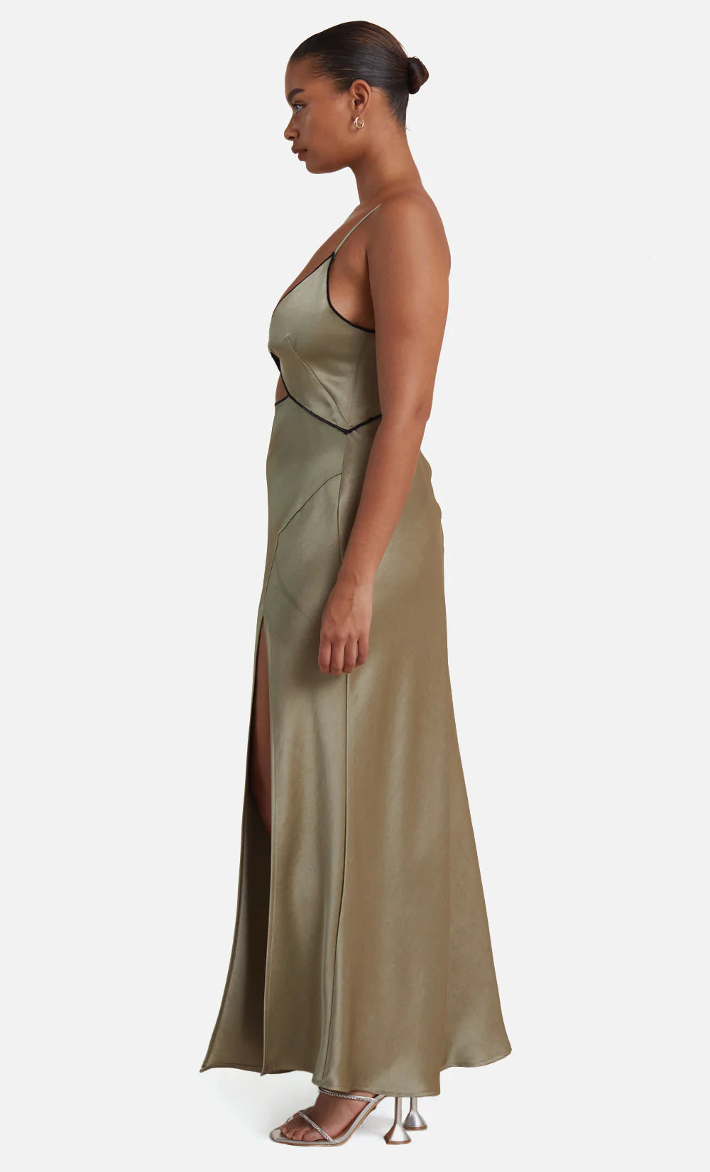 Crafted from a satin fabric in a timeless silhouette, the Hazel Dress features a twist top with flattering underbust cutout, and an alluring thigh-high split. The dress is accented with overlocked stitch detailing.