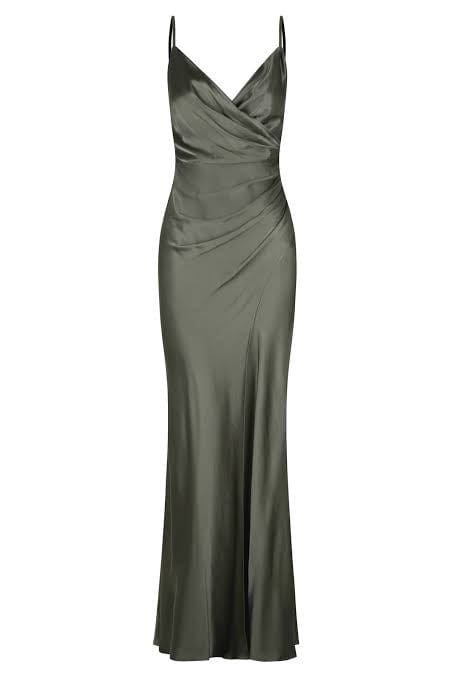 - Cross over cowl draped maxi dress in a silk touch fabric with a luxurious sheen.