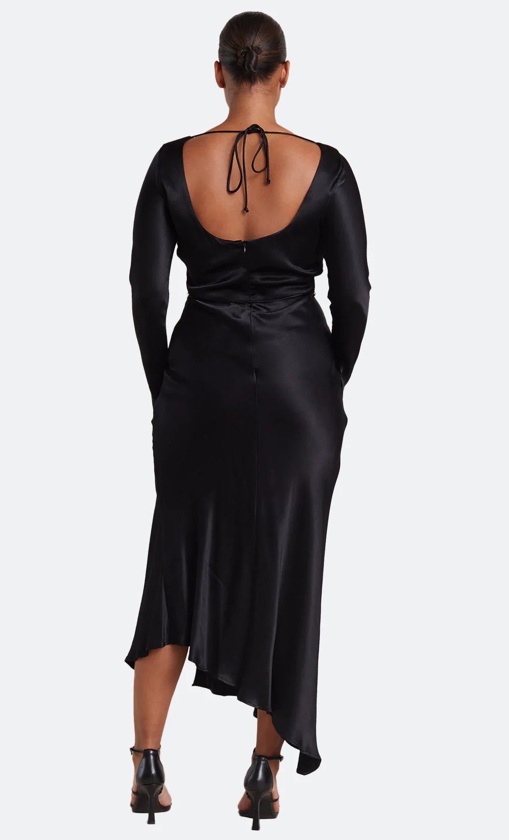 A stylish option for a cool weather wedding, the long sleeve maxi dress is cut on the bias with a cinched tie waist to create a flattering hourglass silhouette. The midi dress features a slight cowl on the high neckline with a low scoop back and leg split in the skirt.