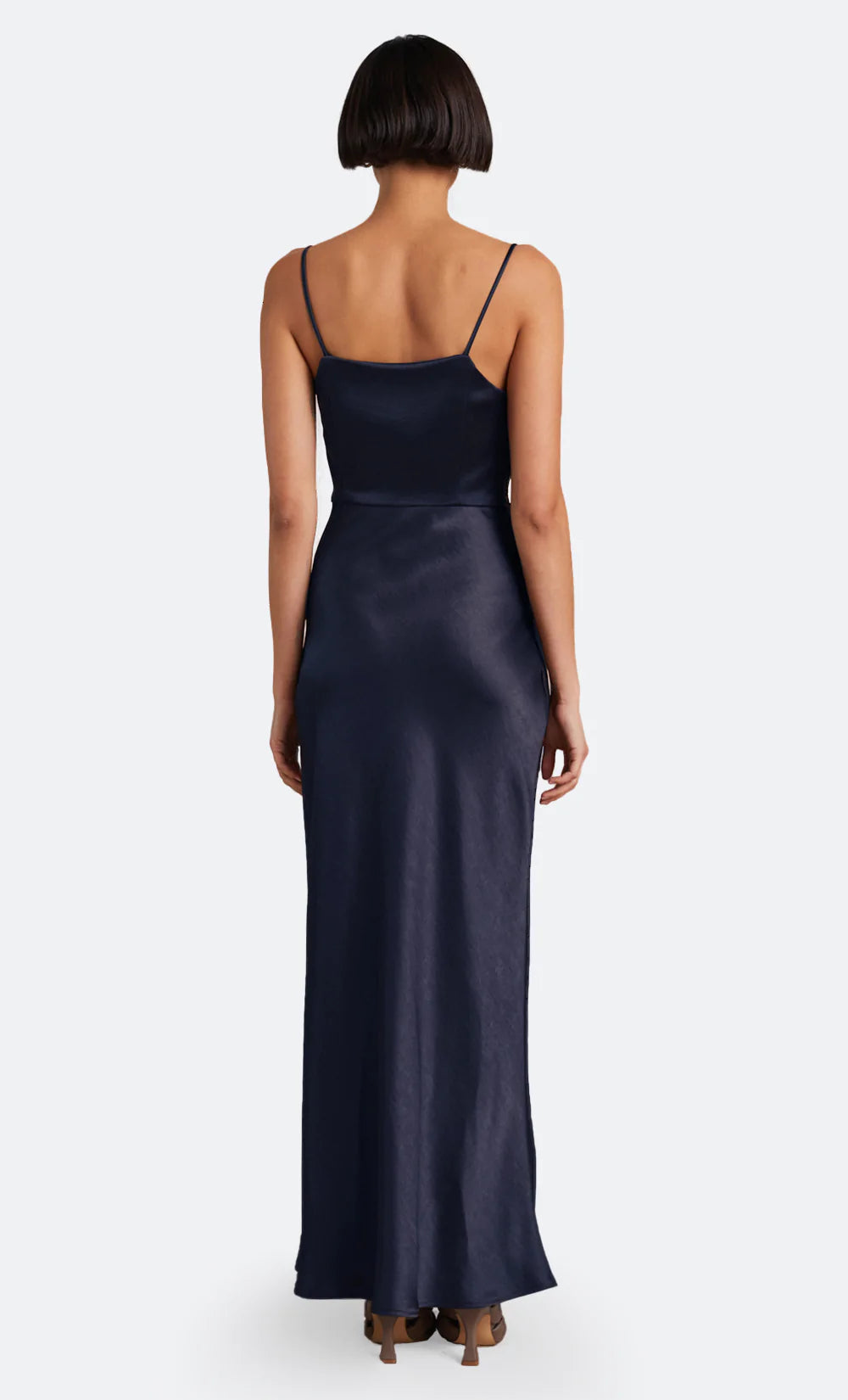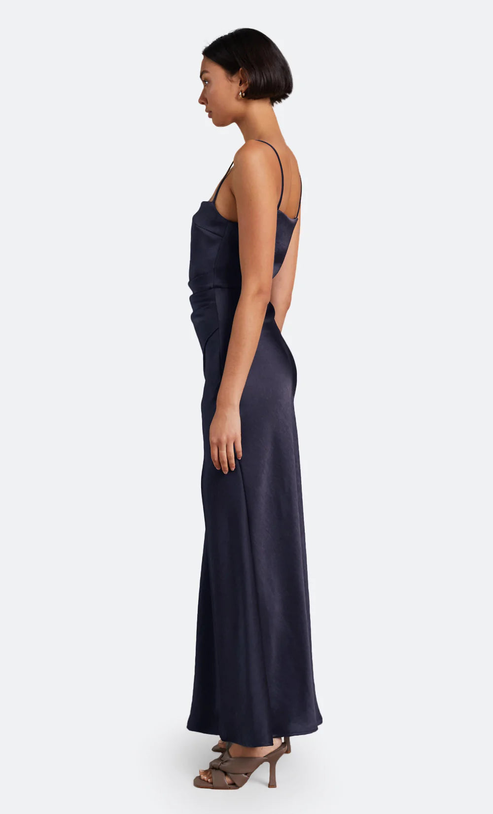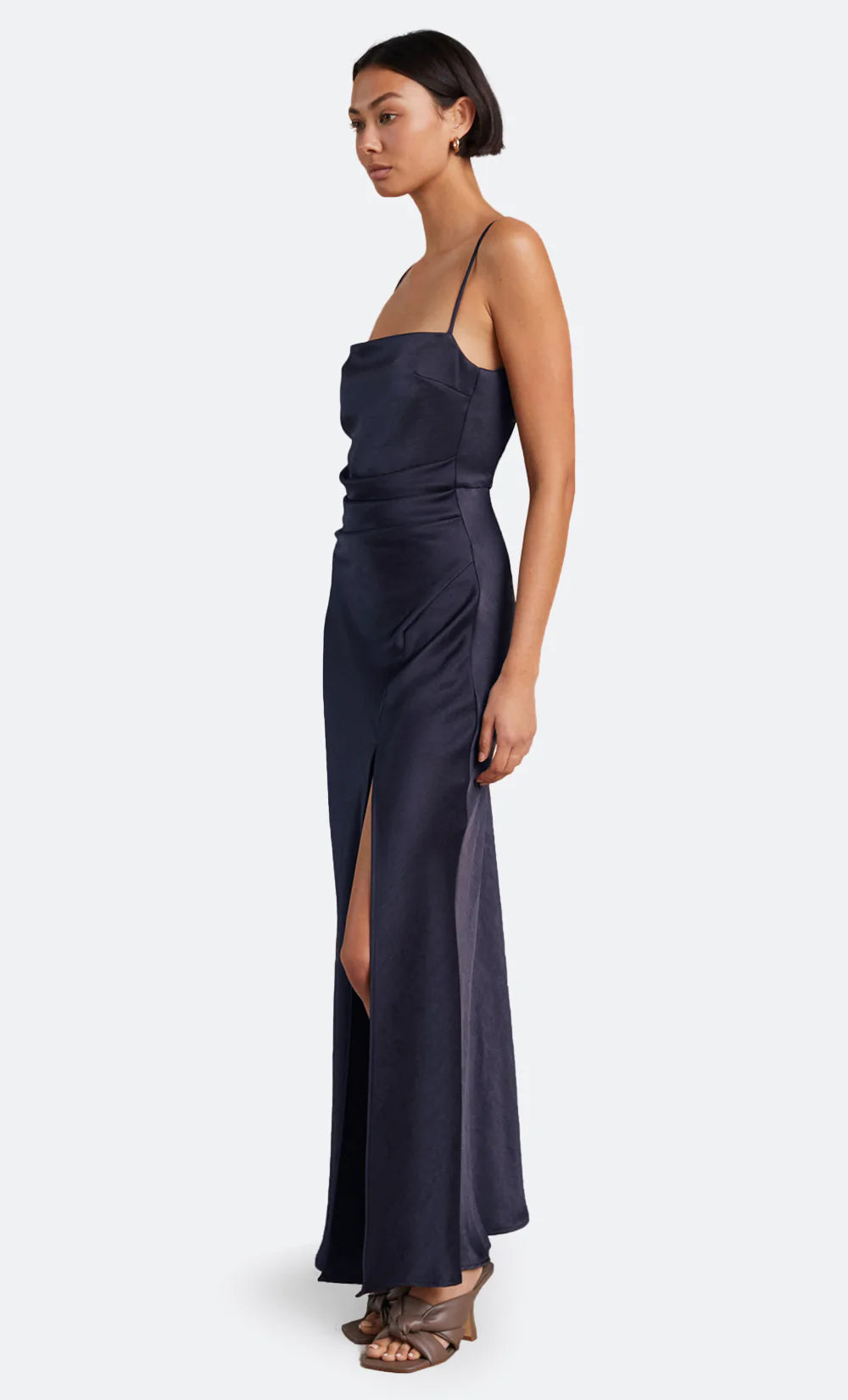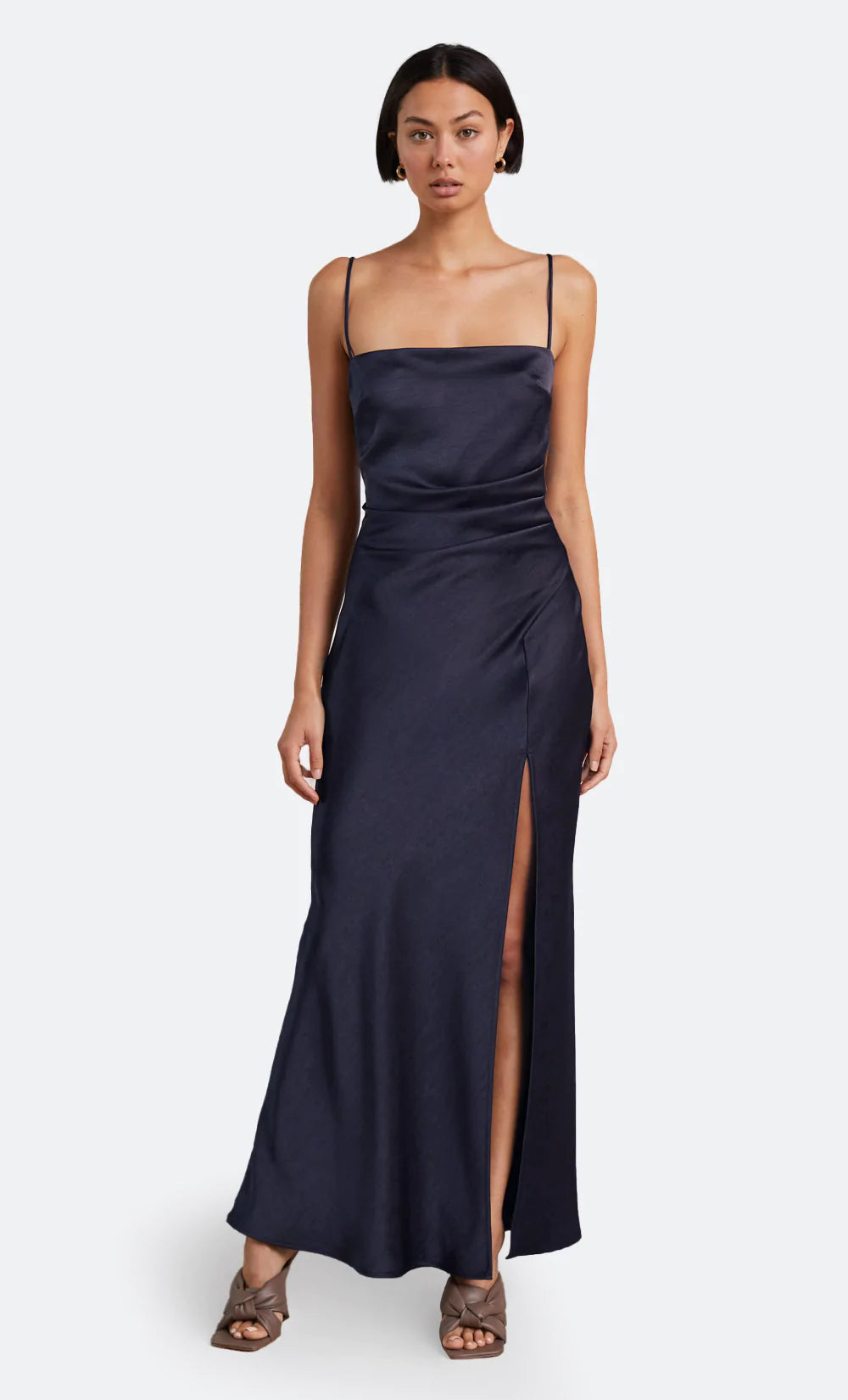 The Nadia Maxi Dress is a flattering bias cut event wear style with a gathered detailing at the waist that disguises any unwanted shapes on the stomach. The maxi dress features a straight neckline with a fitted bust, rouleau straps, and a relaxed flowy skirt with a front split hem.