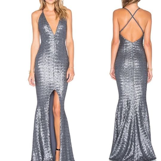 - Sequin long gown with cross over straps at back with front split