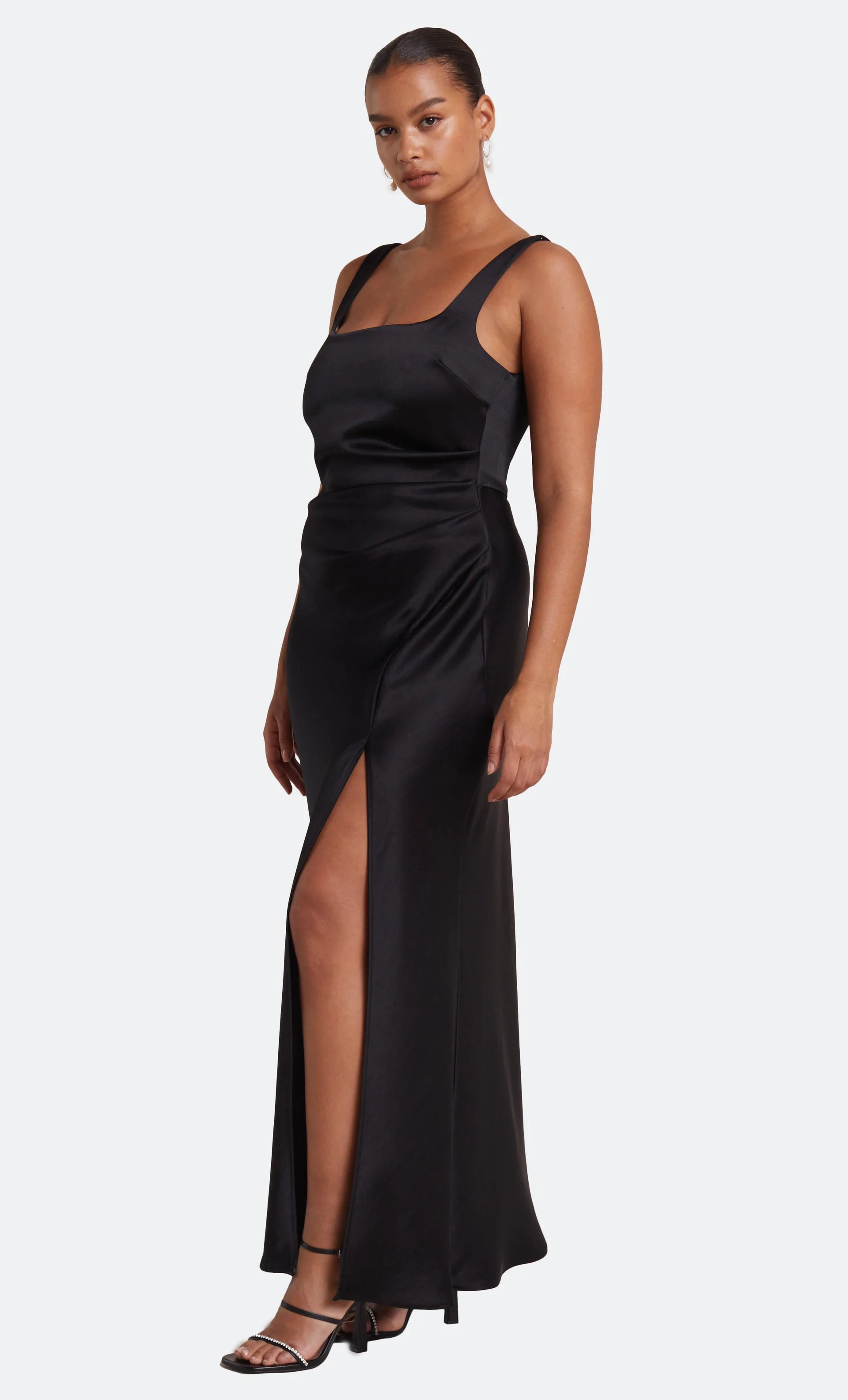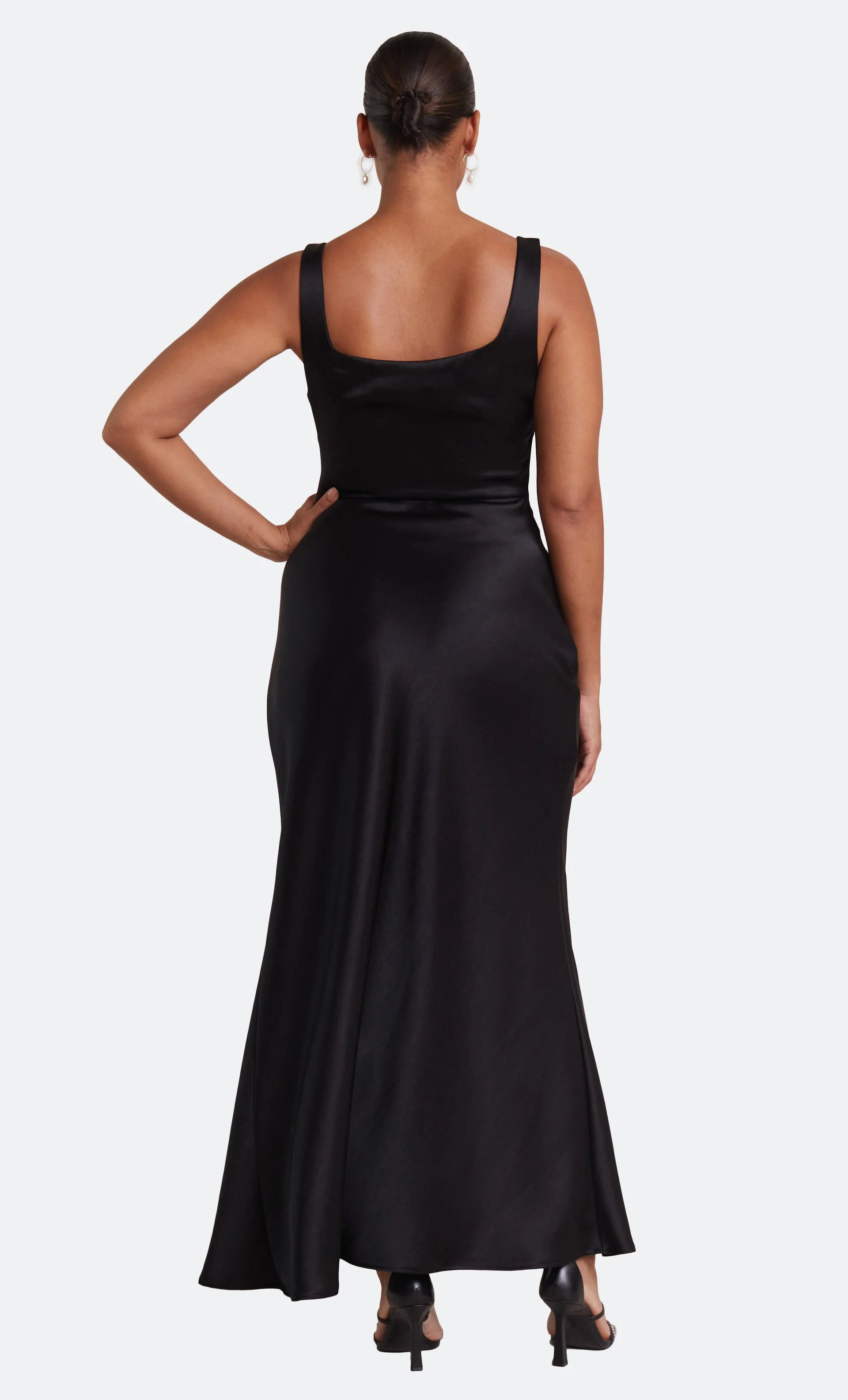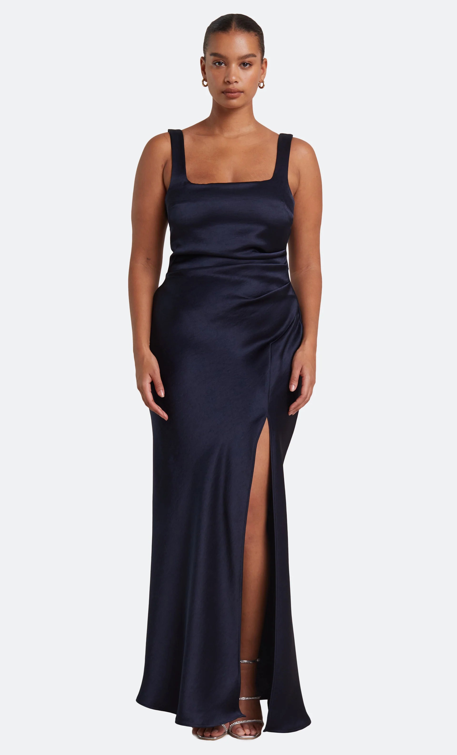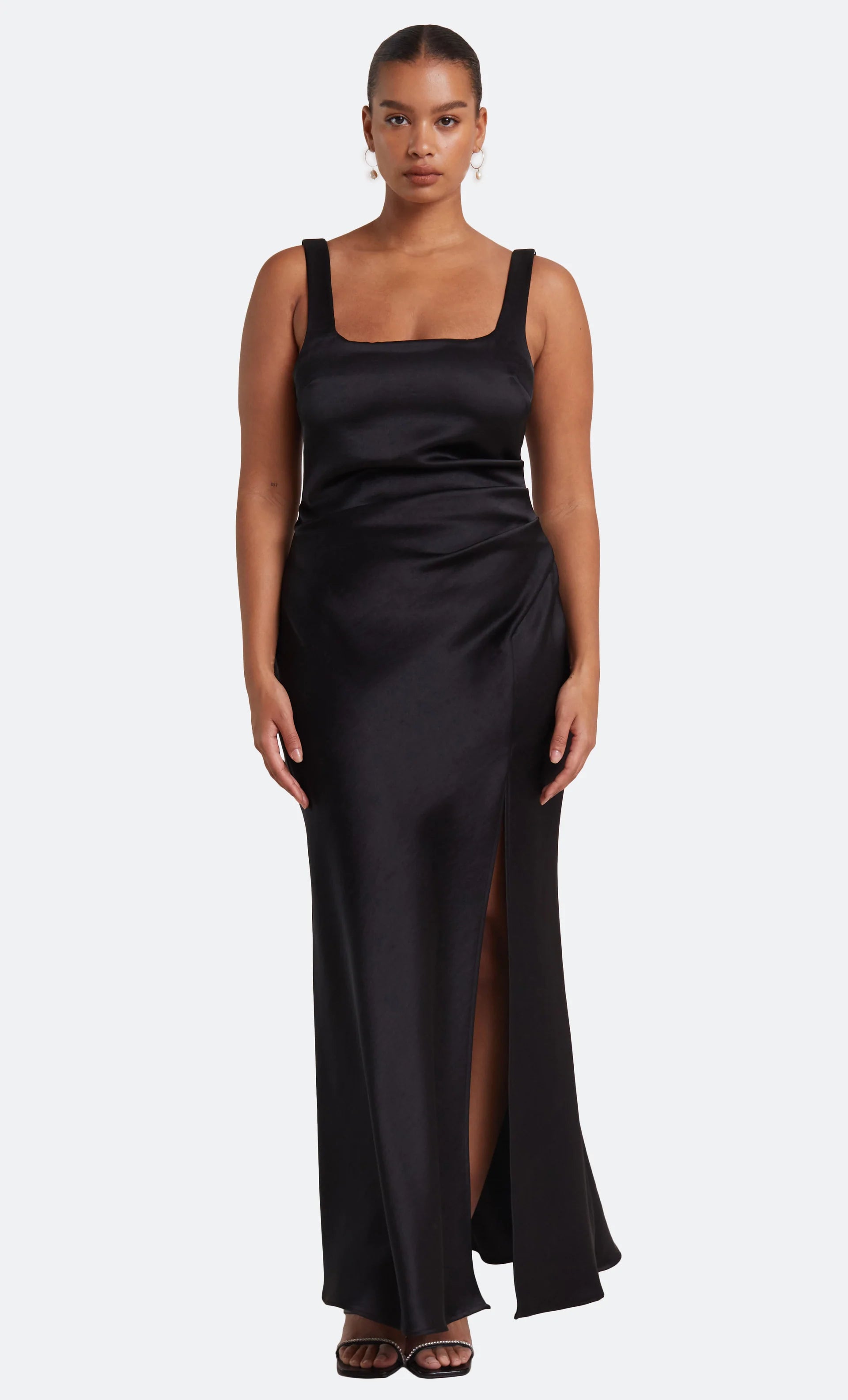 A timeless classic, the Dreamer Square Neck Dress is an easy to wear formal style that flatters all silhouettes. The maxi length dress features a square neckline and a dramatic side leg split. The gathering detail around the waist and hips disguises any unwanted lines on the body.
