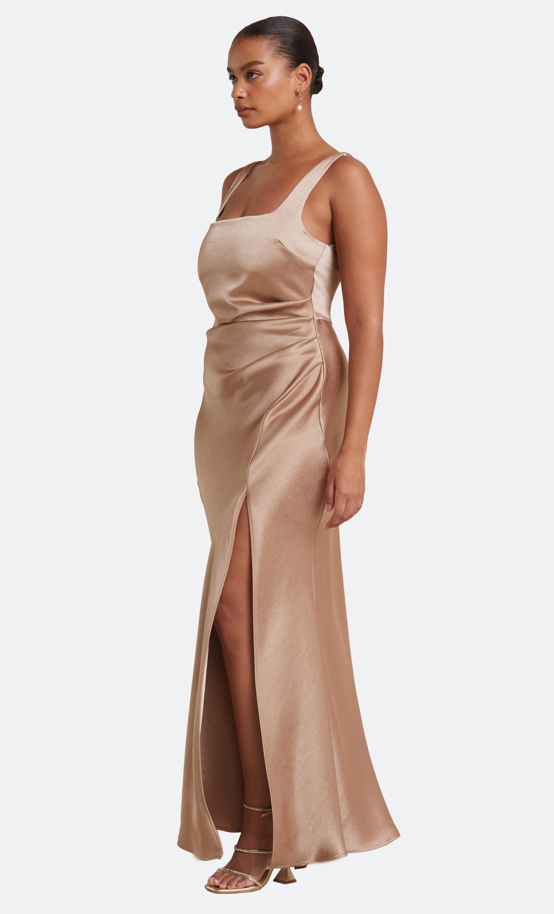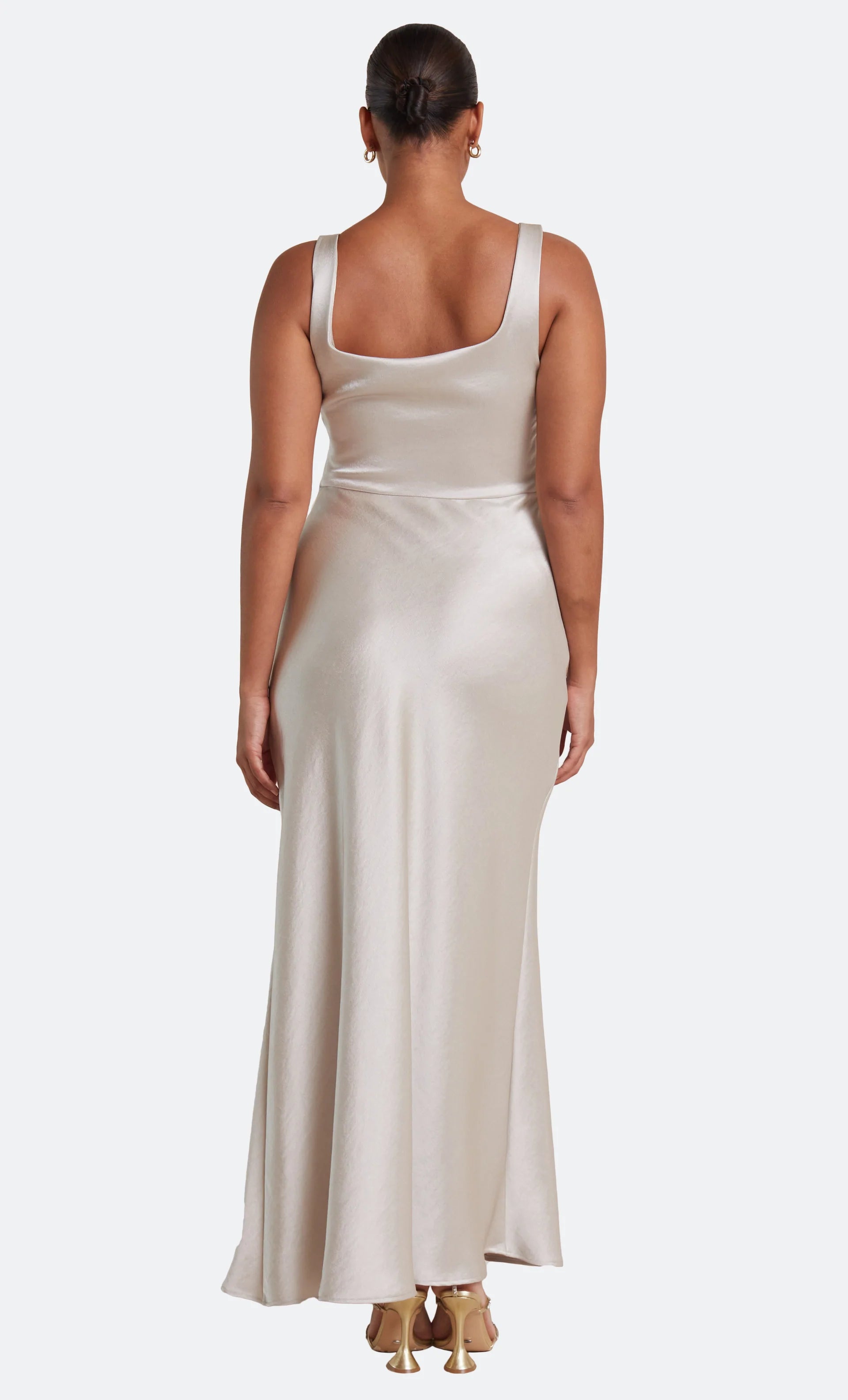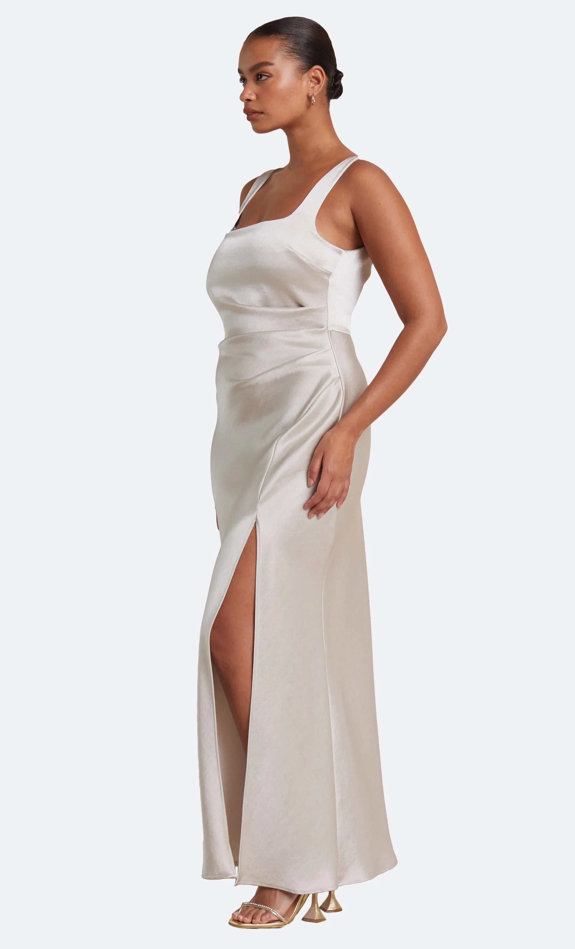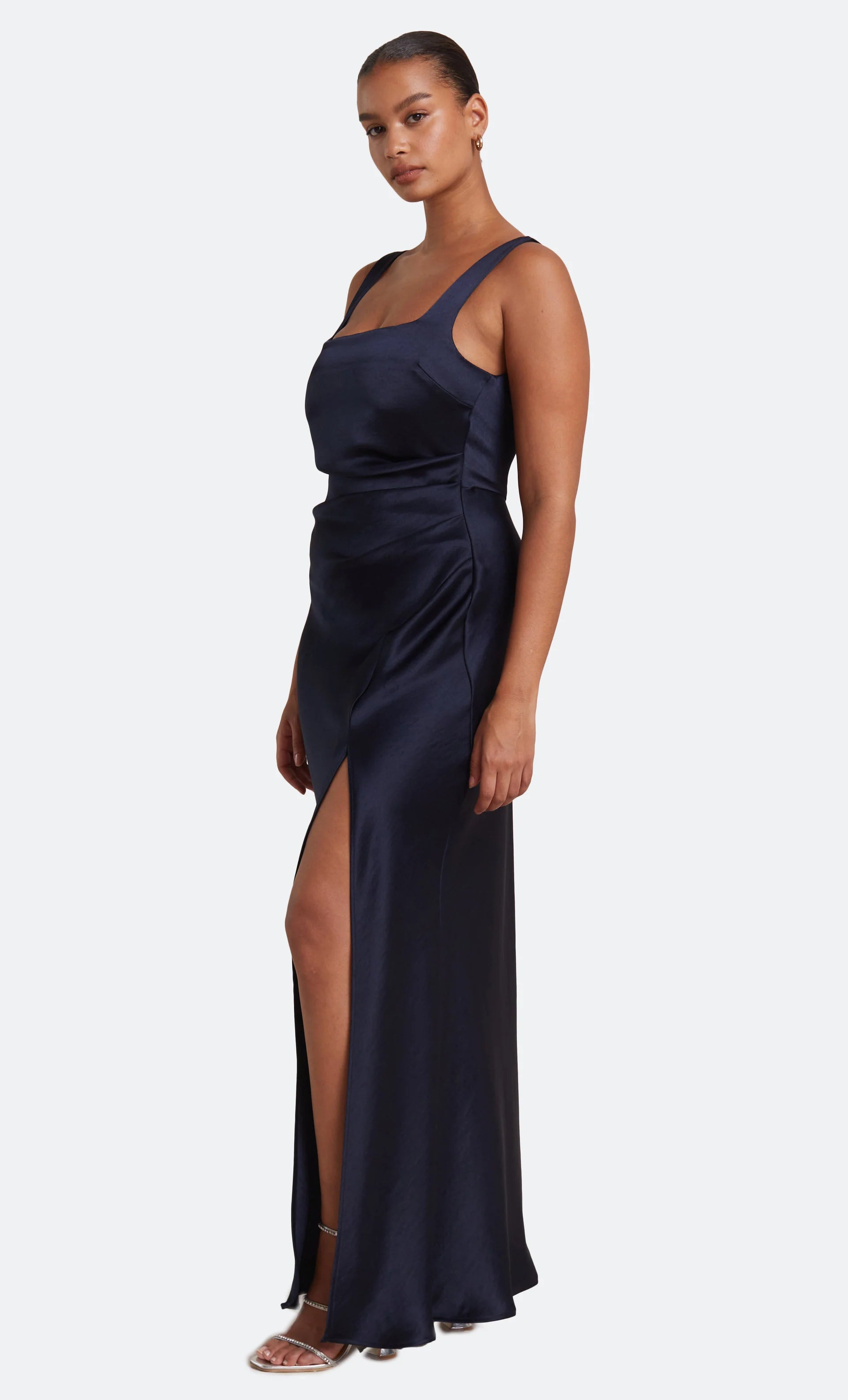 A timeless classic, the Dreamer Square Neck Dress is an easy to wear formal style that flatters all silhouettes. The maxi length dress features a square neckline and a dramatic side leg split. The gathering detail around the waist and hips disguises any unwanted lines on the body.