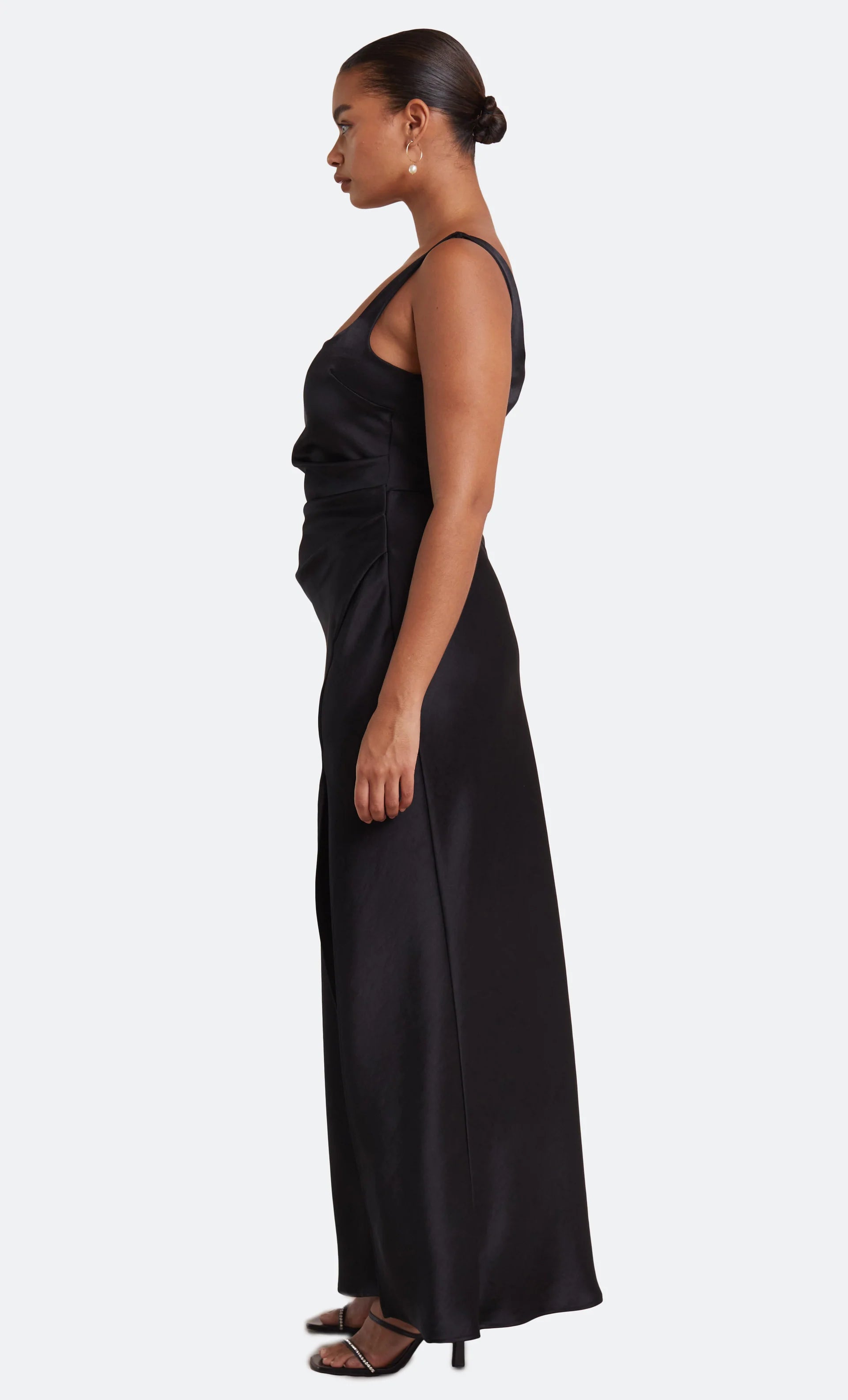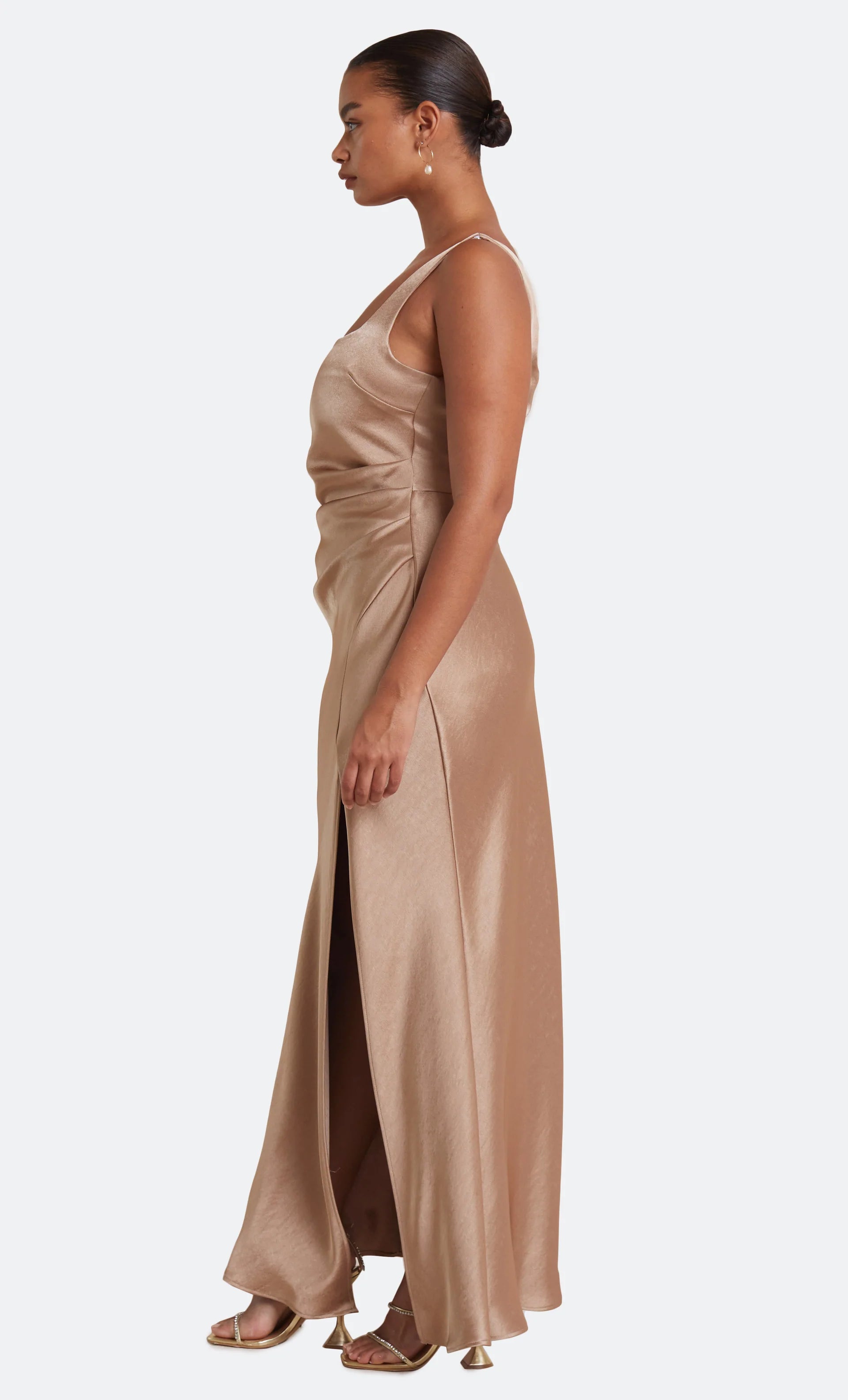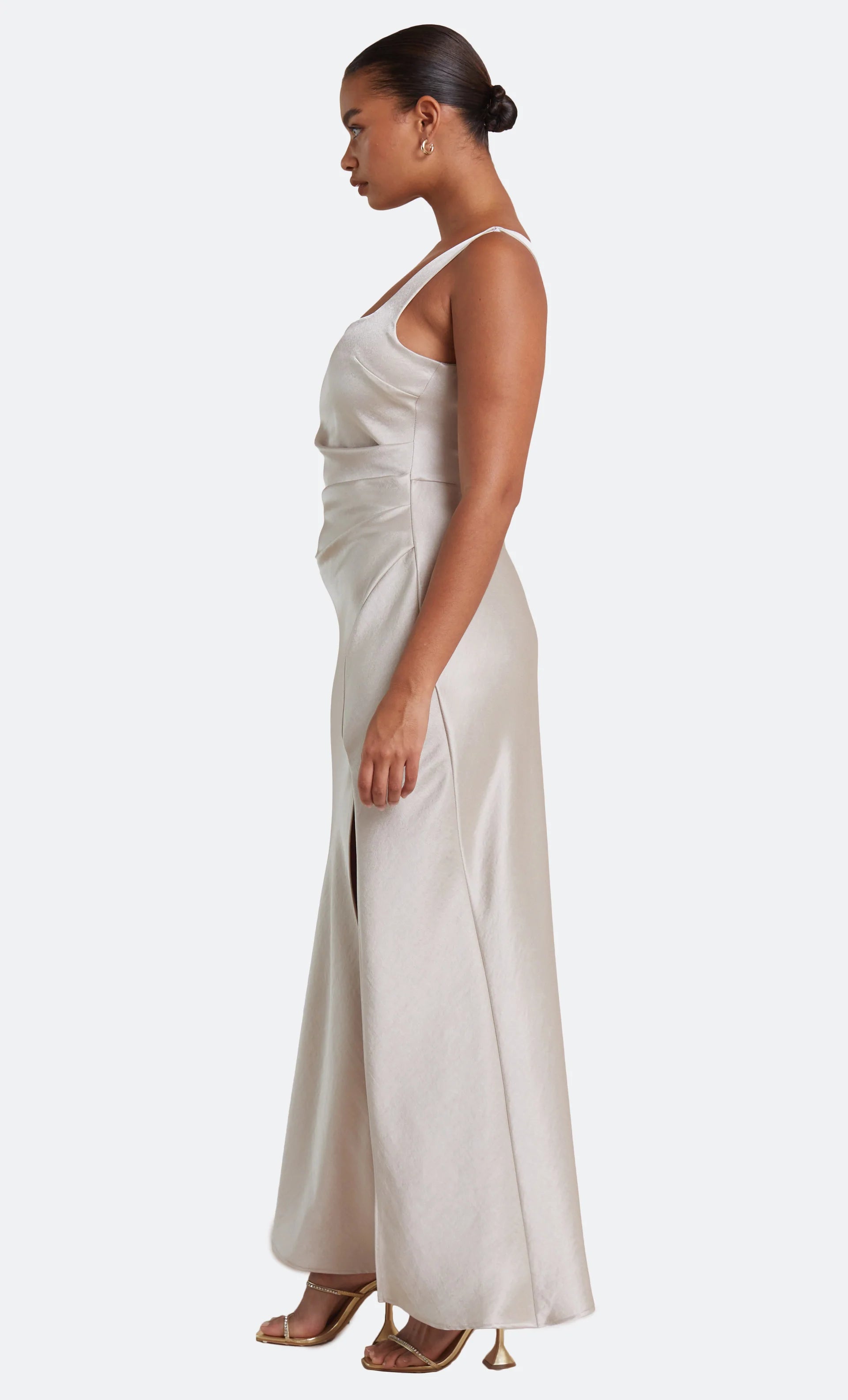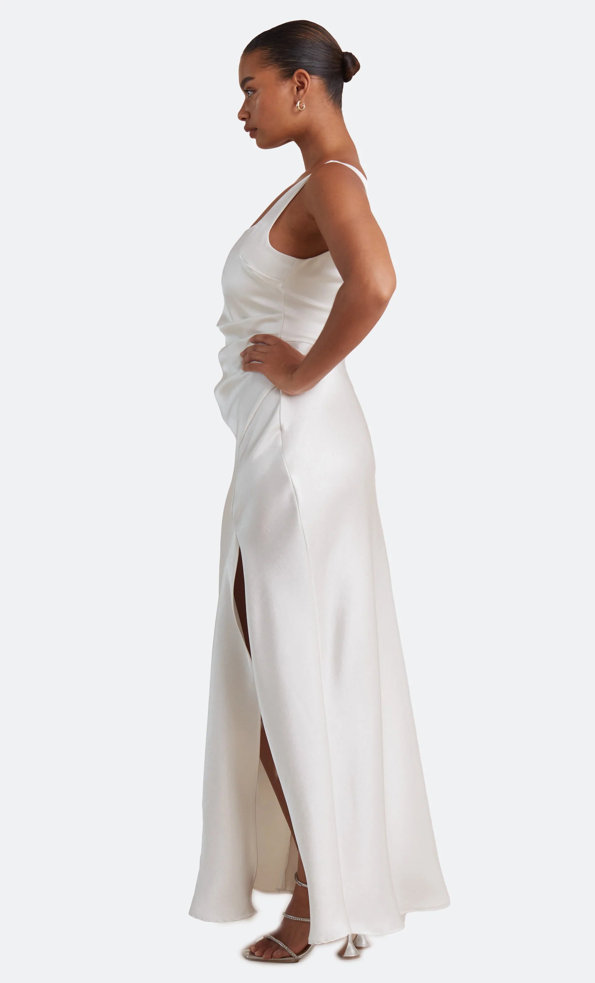 A timeless classic, the Dreamer Square Neck Dress is an easy to wear formal style that flatters all silhouettes. The maxi length dress features a square neckline and a dramatic side leg split. The gathering detail around the waist and hips disguises any unwanted lines on the body.