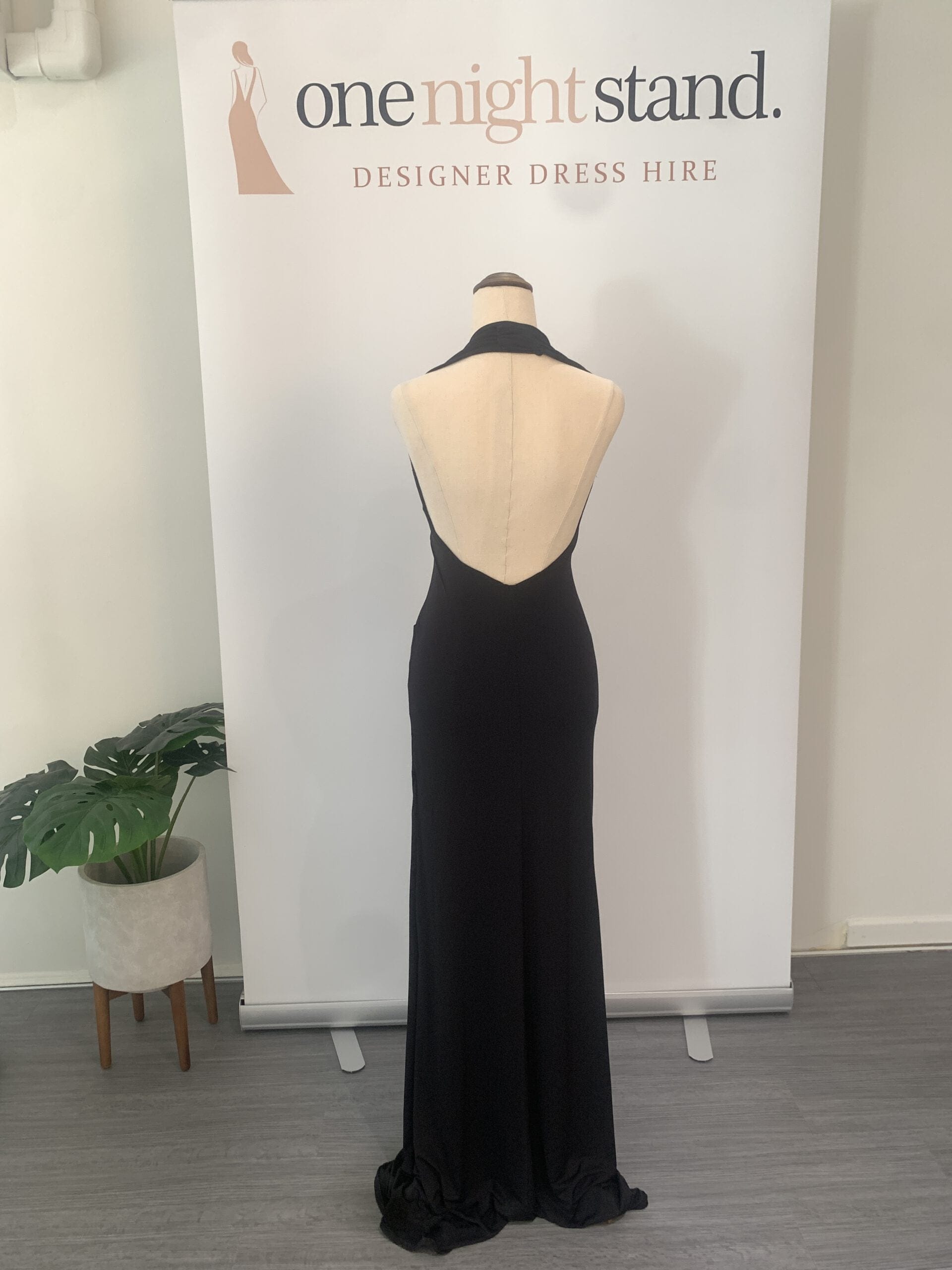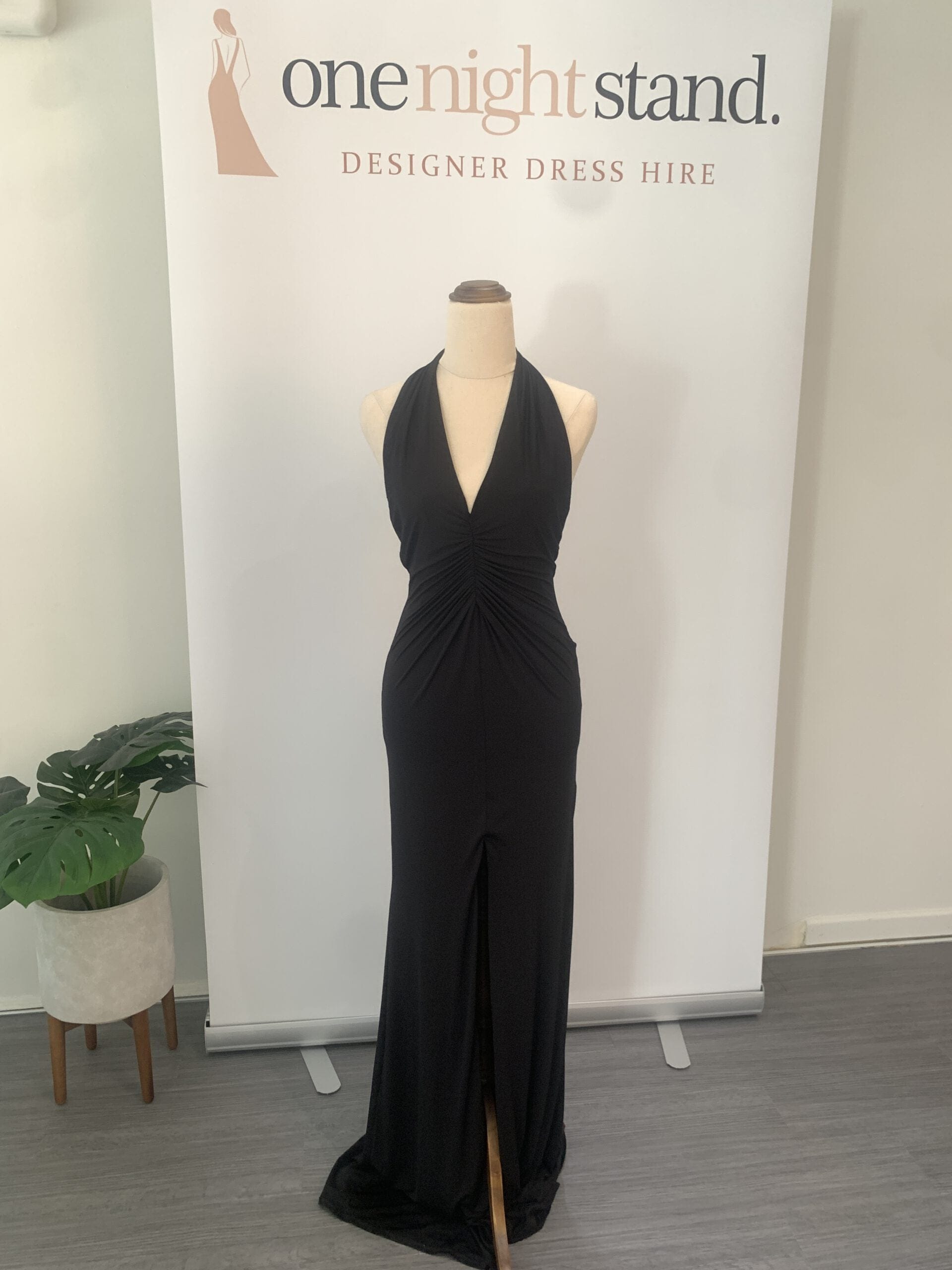 - Halter neck, plunge neckline, backless with split in front of long gown
