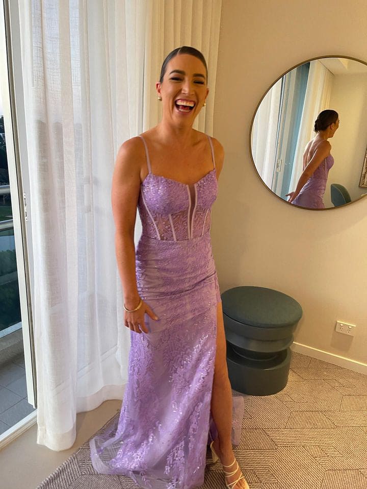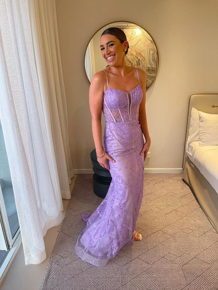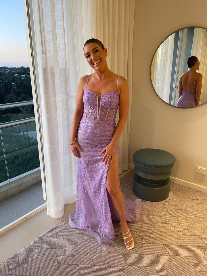 Tina Holly TE215 is a stunning full length, corset style gown, high side split with a touch of sparkle on the lace applique featured on the Lilac & Fuschia gowns.