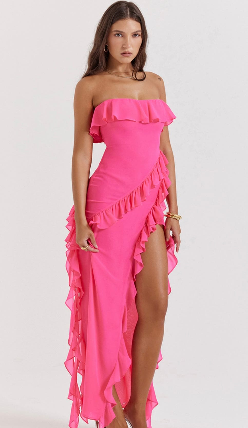 'Sarina' is our gorgeous strapless creation that's beautifully designed with fluttery ruffles for the prettiest of details. Cut from lightweight georgette, 'Sarina' is ultra sexy yet elegant in a fuchsia hue.