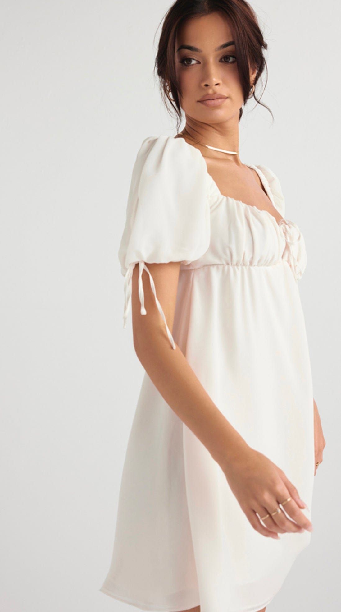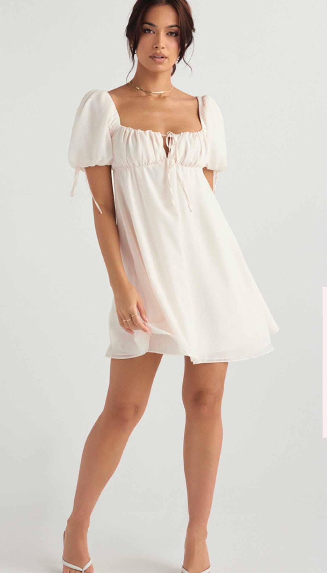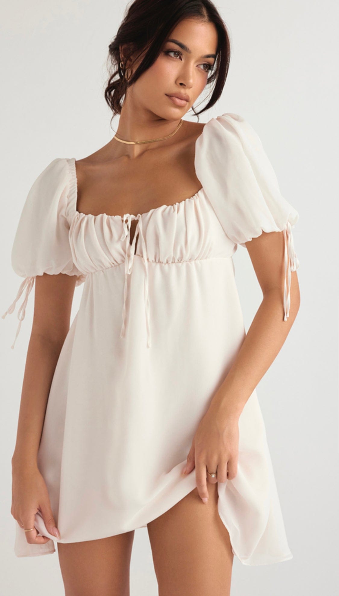 - Short and sweet, our 'Princess' is a mini dress with an Empire cut and gathered bust. It's set in a beautiful ivory hue that's perfect for sunny days and has an ultra feminine swing shape. The pretty puff sleeves and short hemline add to the feminine vibe. Fully lined for comfort, it zips to the back for easy on.