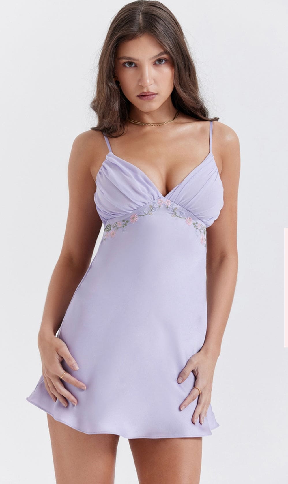 Perfect for spring and a vacation favourite, 'Christa' is embroidered with delicate florals that compliment the pretty lavender hue beautifully. Cut from lightweight georgette and luxuriously light satin, it features a pretty sweetheart neckline with softly pleated cups for a flattering cleavage and turns to reveal a cutout back with self ties for the perfect fit and adjustable straps.