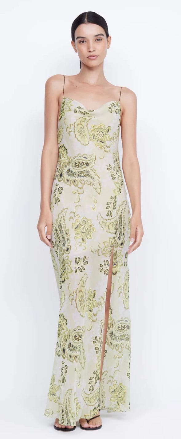 The BEC + BRIDGE Lylou Maxi Dress is crafted from a lightweight, lustrous printed fabric in a flattering silhouette. The bias cut maxi dress features a cowl neckline, thin cord shoulder straps that tie at a statement open cowl back and lining to the mini length.