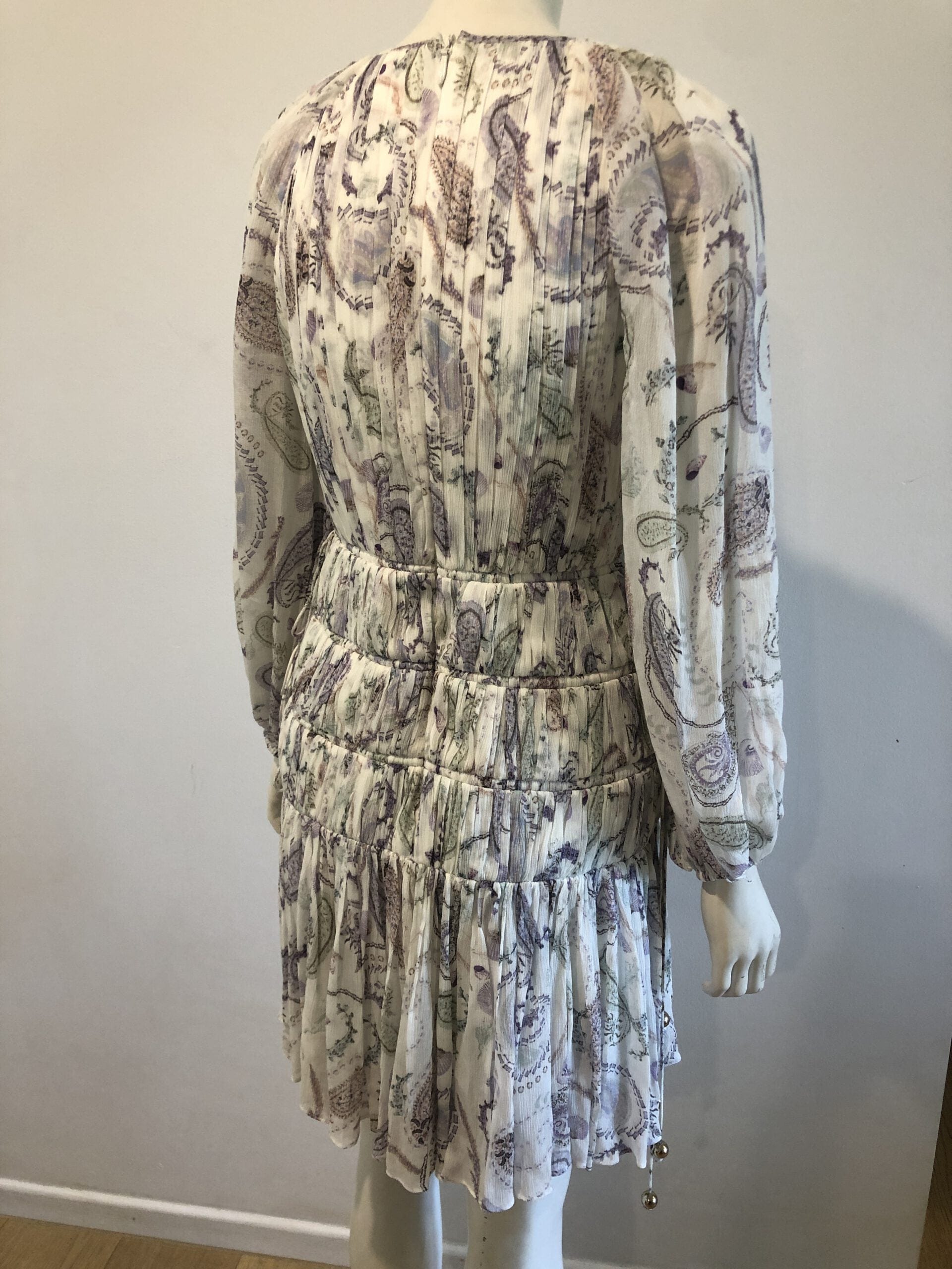 - Long sheer sleeved white and lavender floral mini dress