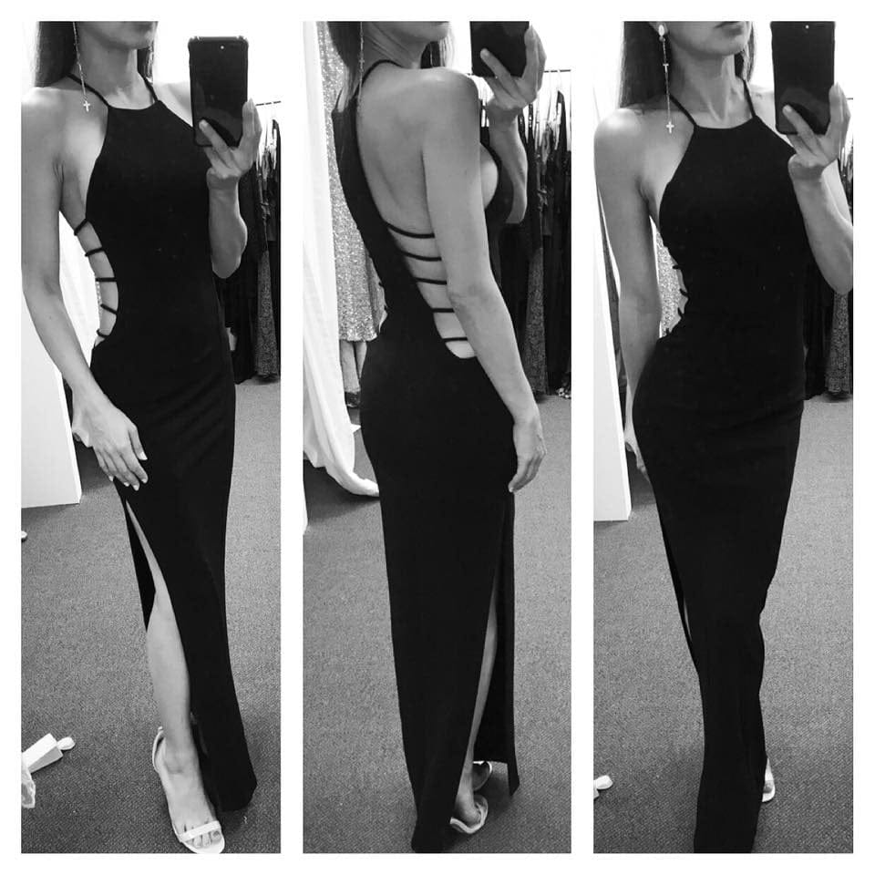 - Long dress, high neck, cut out sides with side split