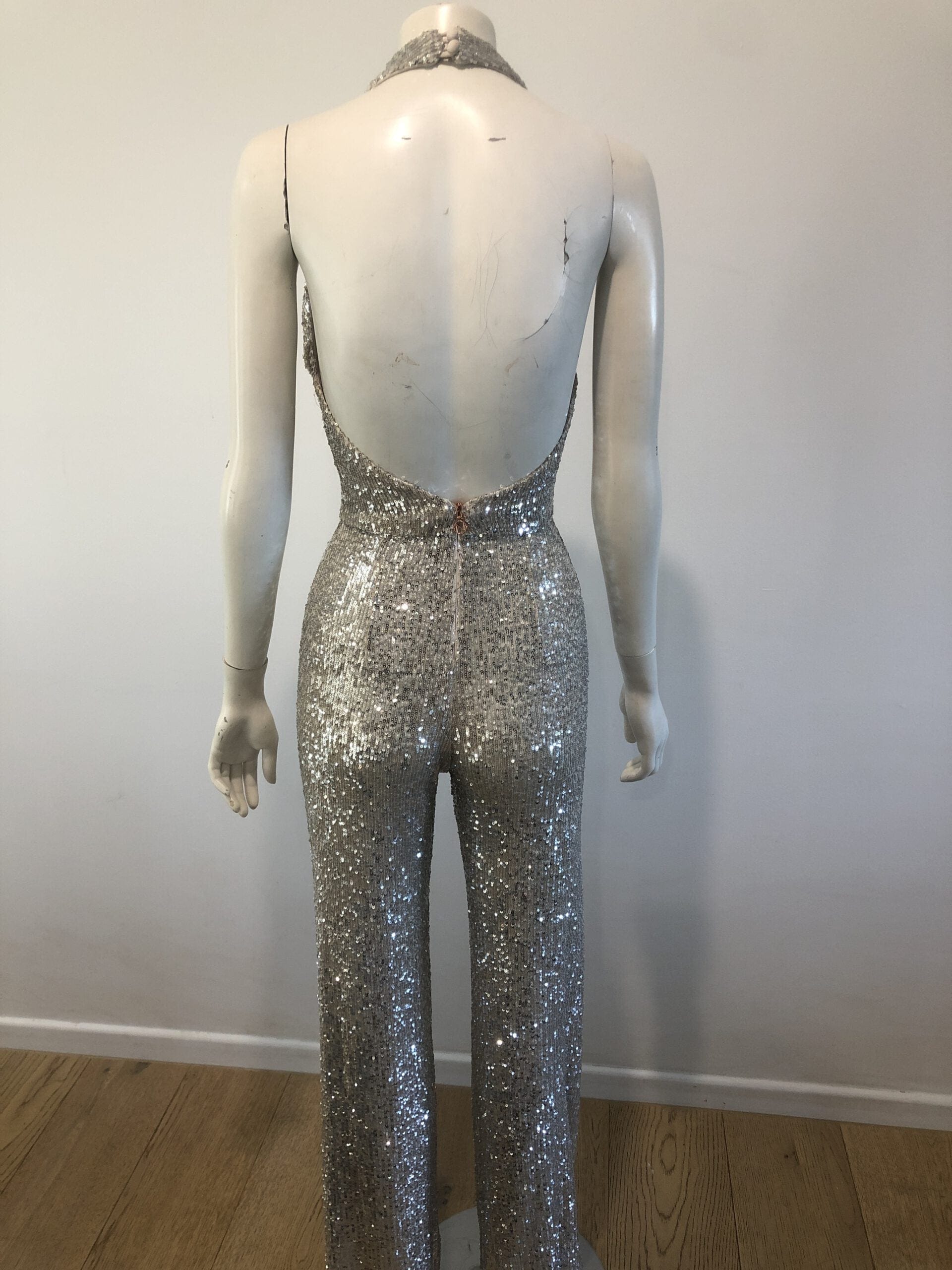 - Silver sequin with halter neck and cowl neck full relaxed leg jumpsuit