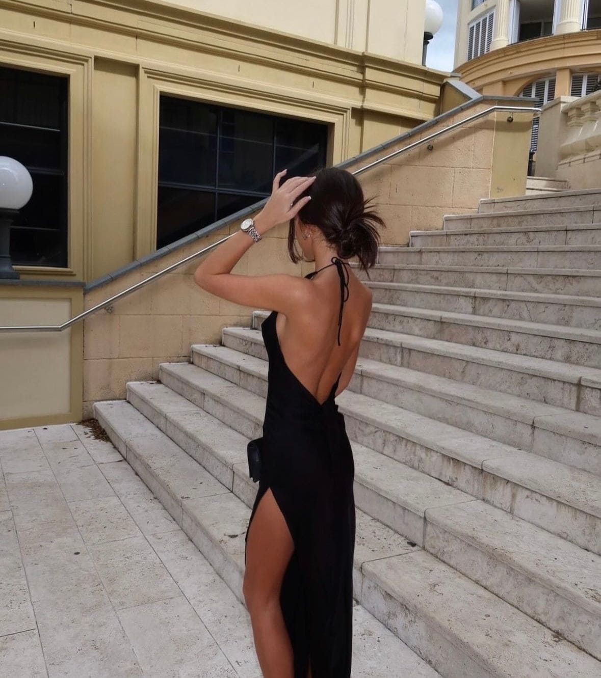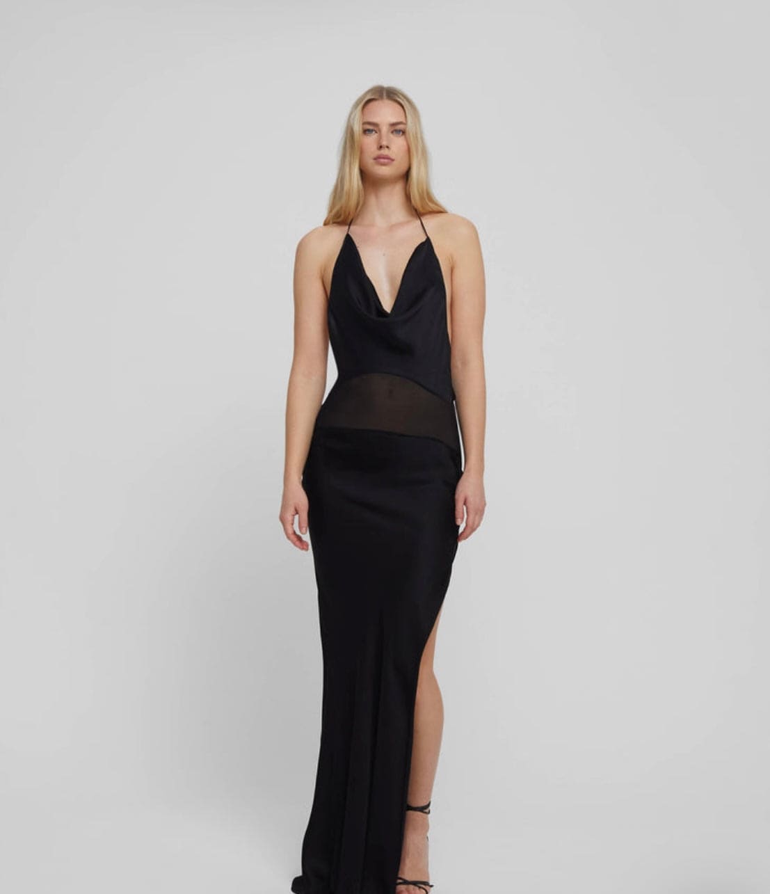 A must-have for any fashion enthusiast. Its fluid silhouette effortlessly drapes the body and features a daringly cut back with knotted detailing and delicate ties. The contrasting panels of lightweight satin and semi-sheer georgette add a touch of dark glamour to this timeless dress, while the plunging cowl and slit skirt exude a perfect balance of grace and seduction.