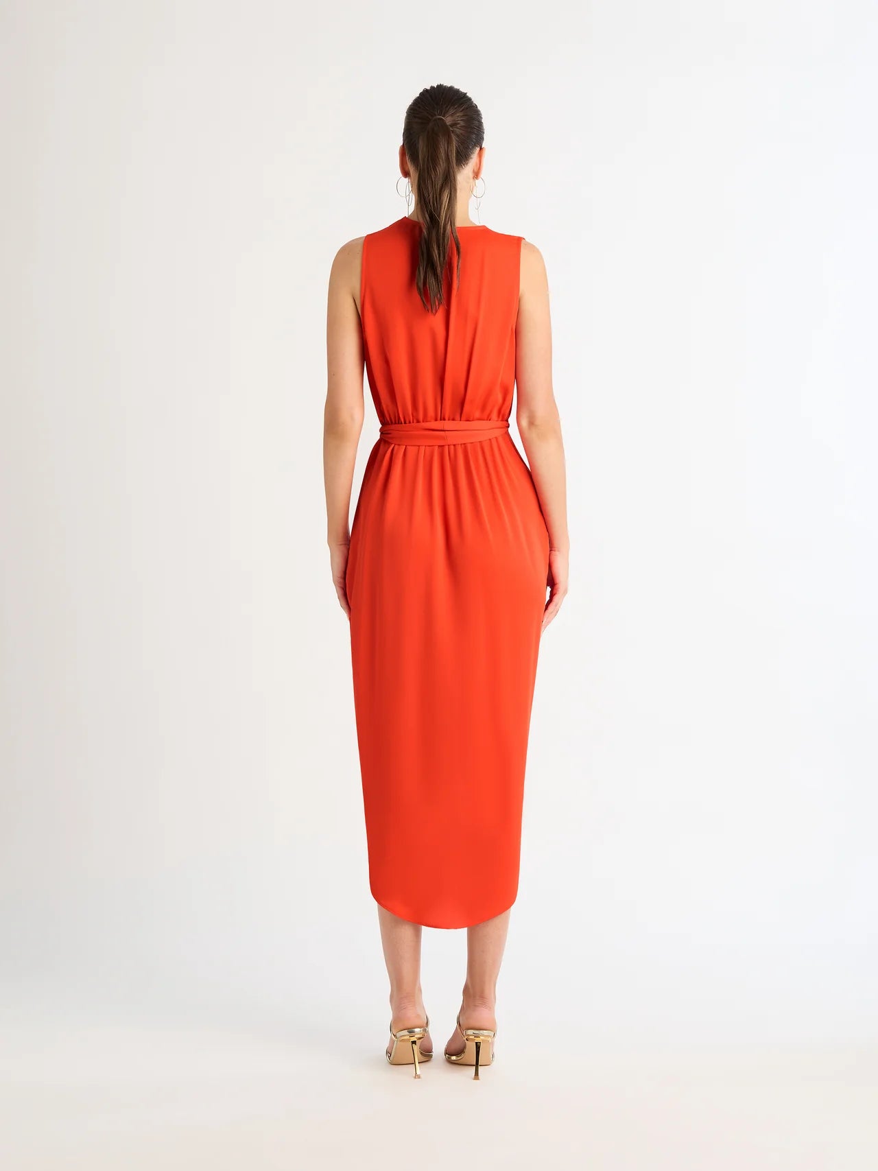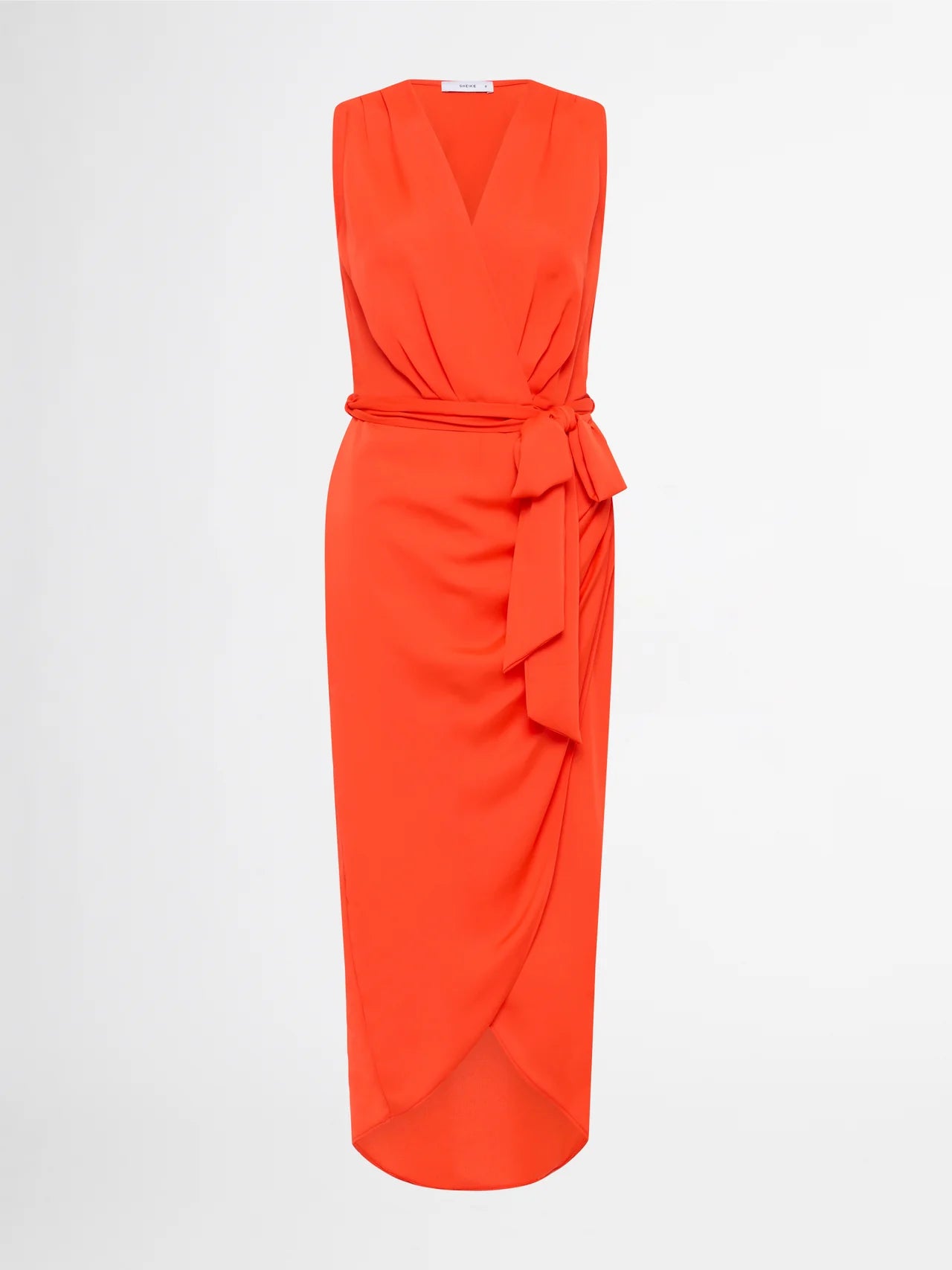 Indulgent bold hues and draping satin silhouettes make up the vibrant Saskia Midi Dress. Showcasing a cross over V neckline, cross over front skirt with pleats at waist and side hip, and elasticated waist.