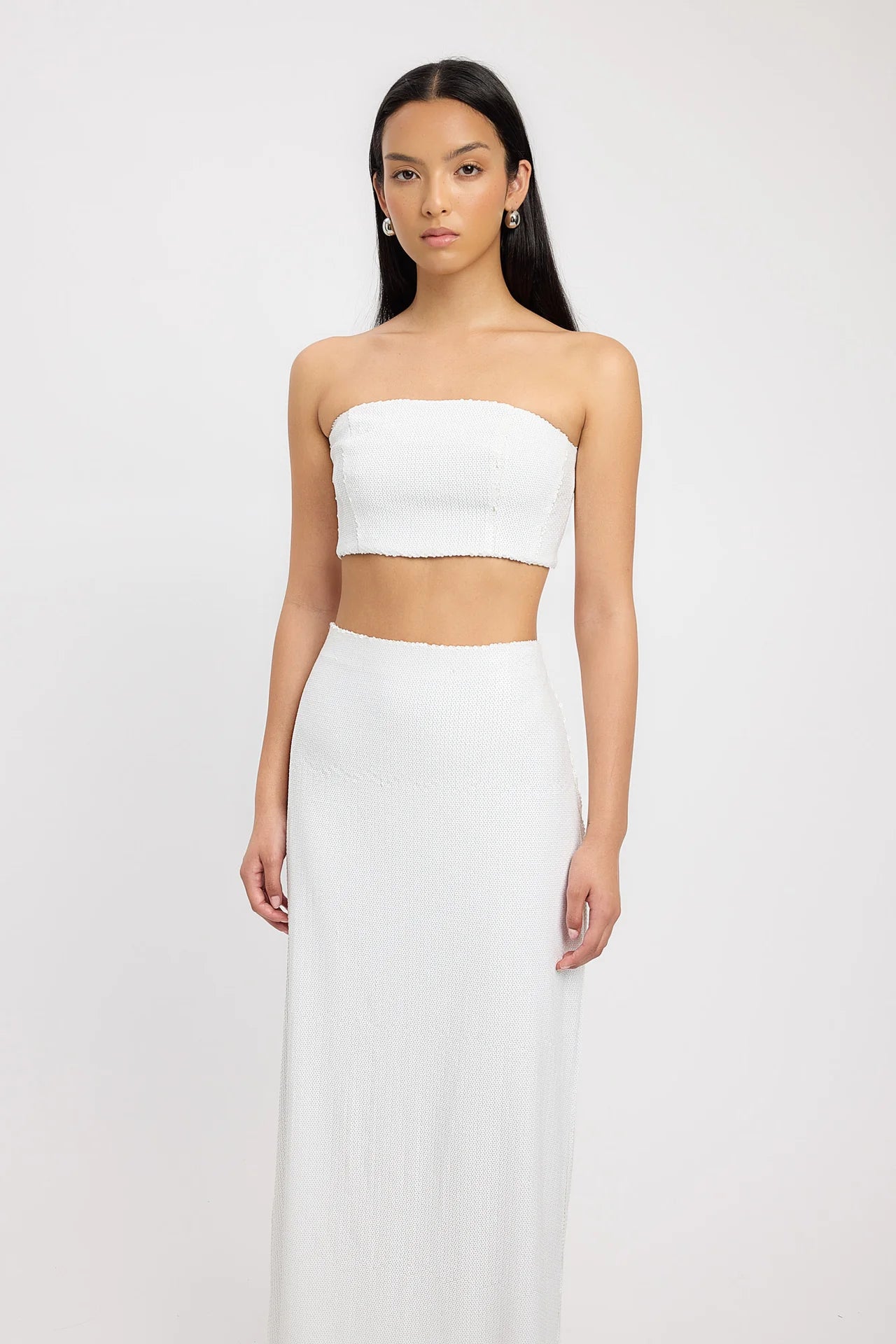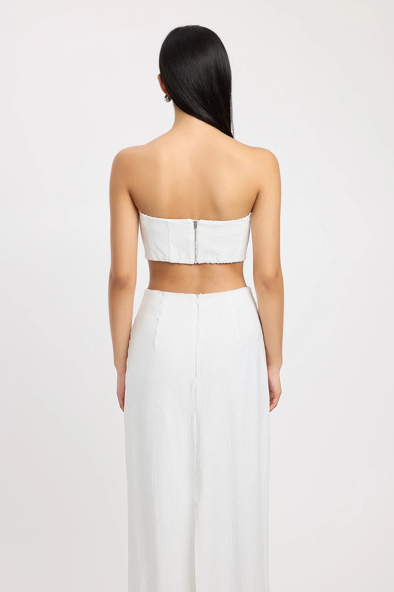 Make a statement in the Siena Sequin Top & Skirt set. Crafted from Kookai sequin fabrication the top is detailed in a white colourway. The corsetry-inspired design has a body-sculpting silhouette with a strapless neckline and cropped finish. The bodice features seam detailing to accentuate the waistline and emulate a flattering figure.