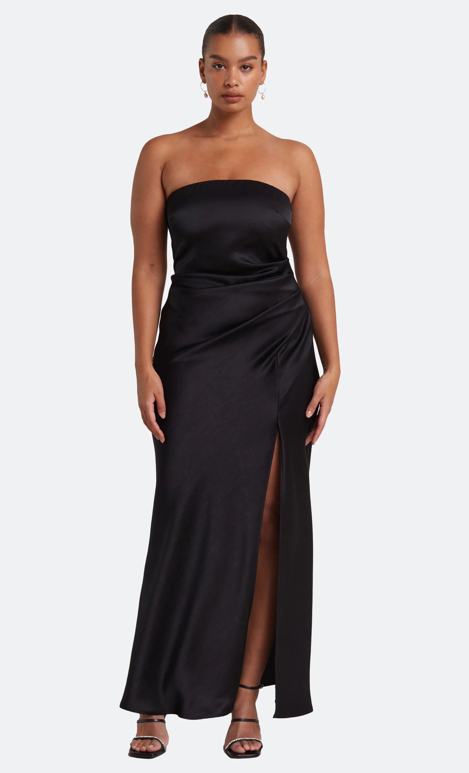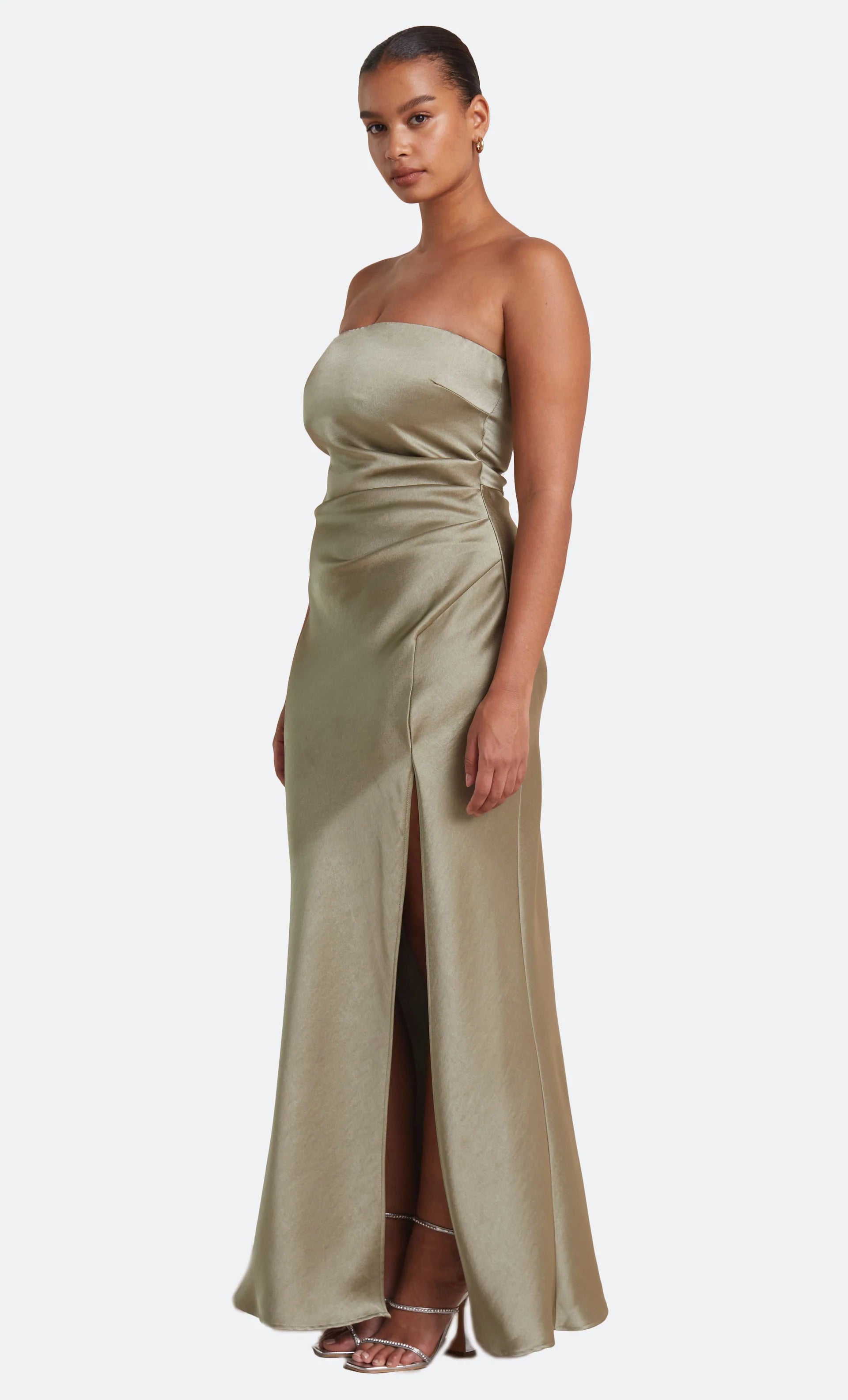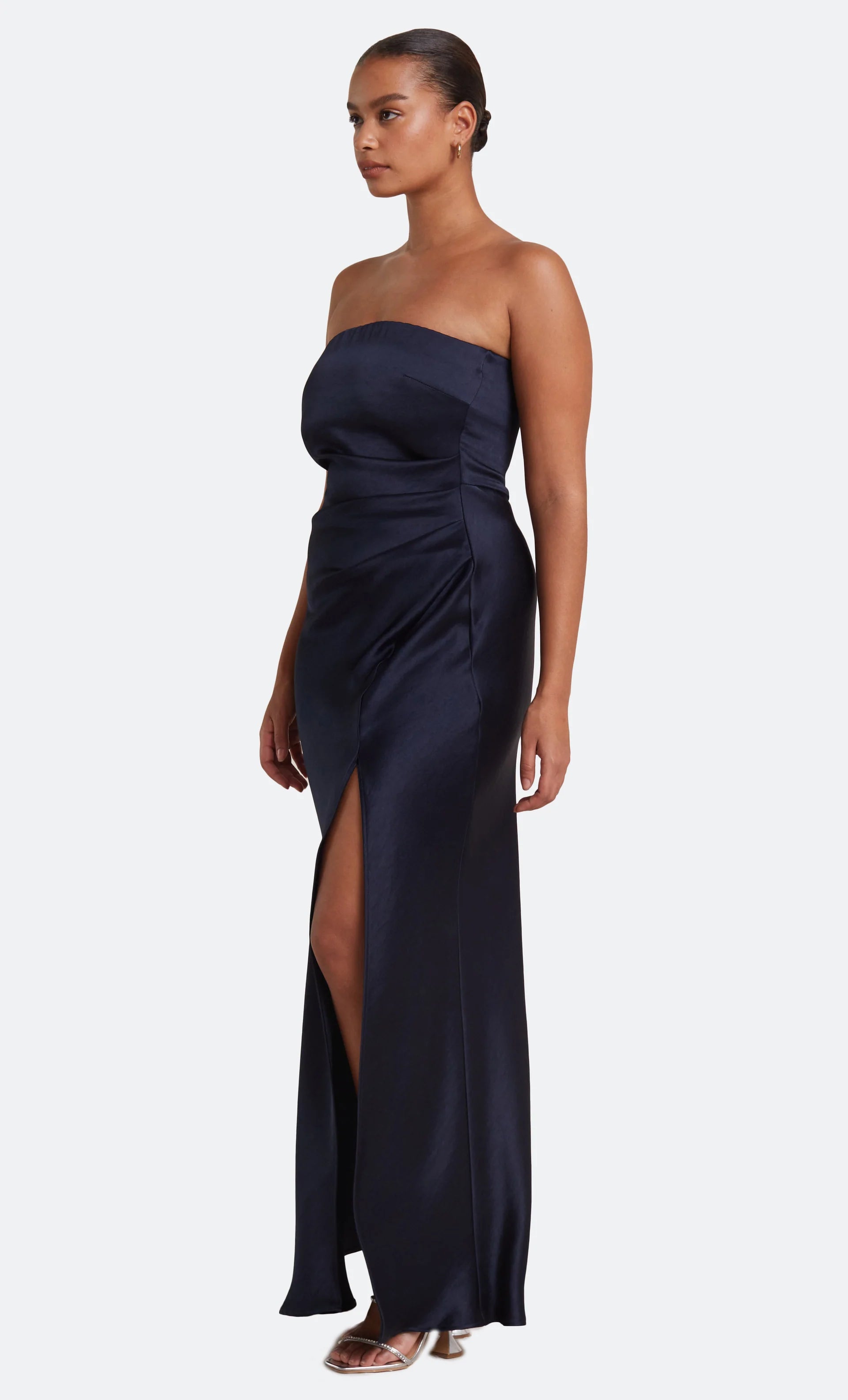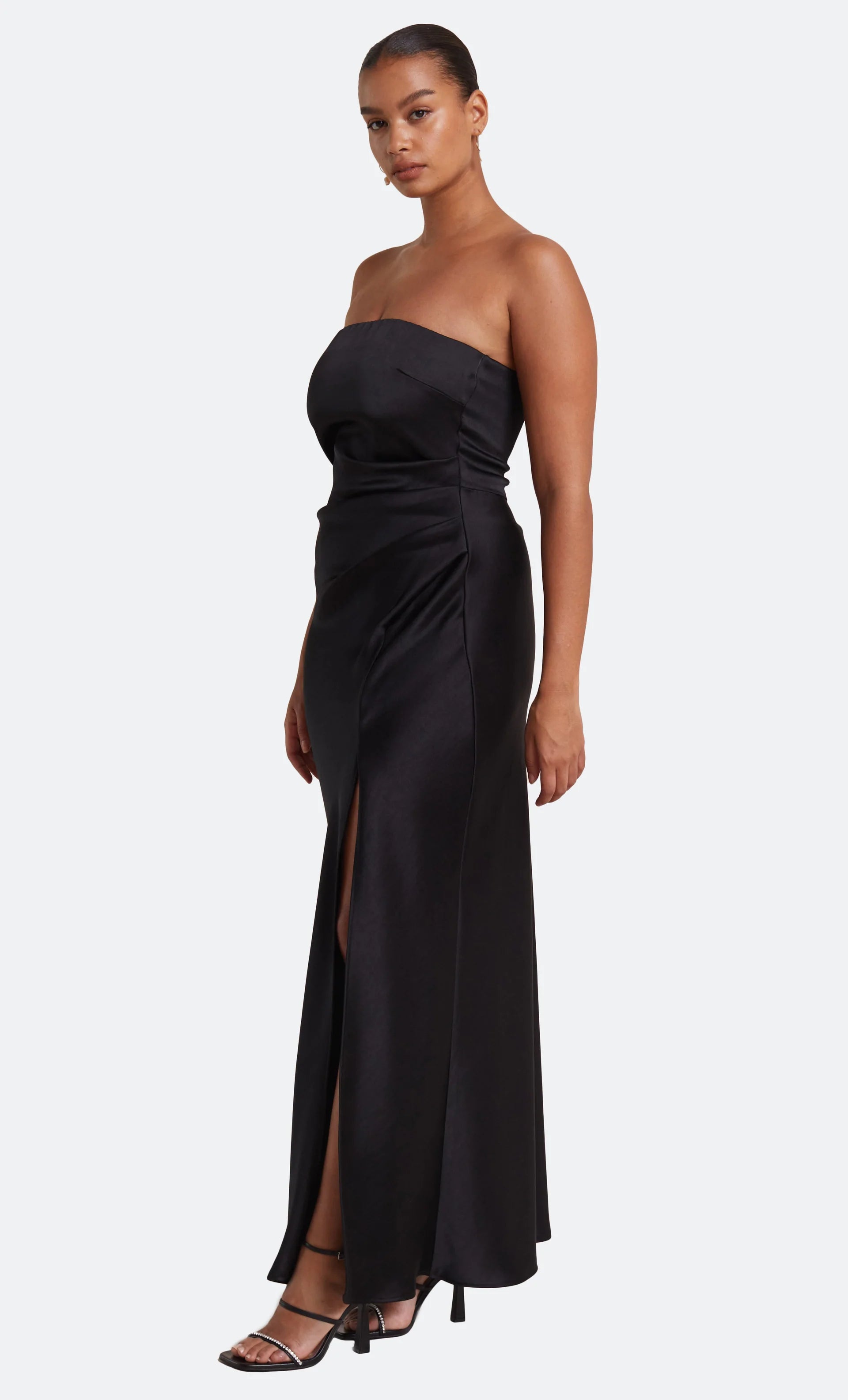 The Dreamer Strapless Dress is a flattering maxi length style with a straight neckline and a statement side leg split. The dress features a gathered effect at the waist and hips to compliment the silhouette and disguises any unwanted lines on the body.