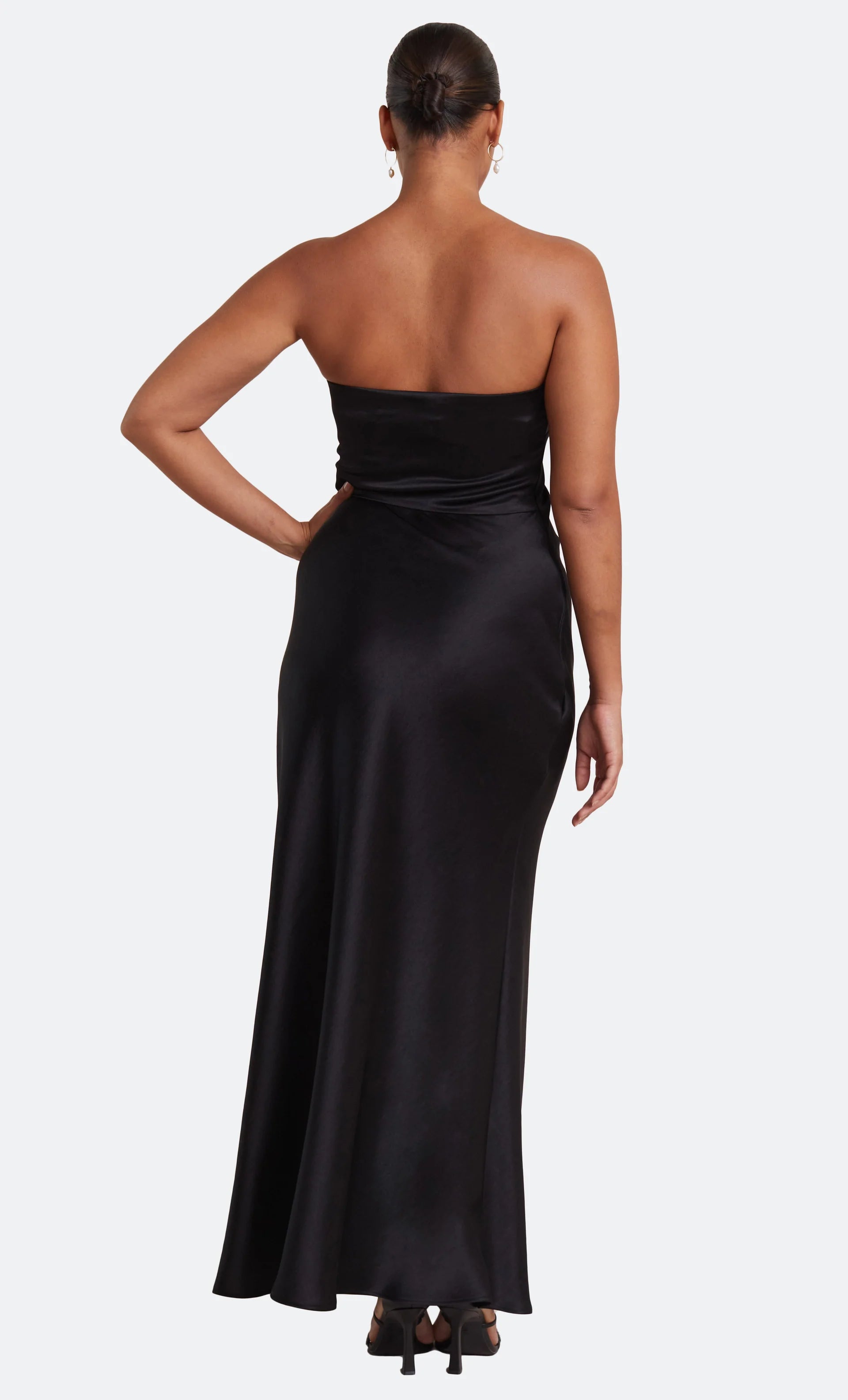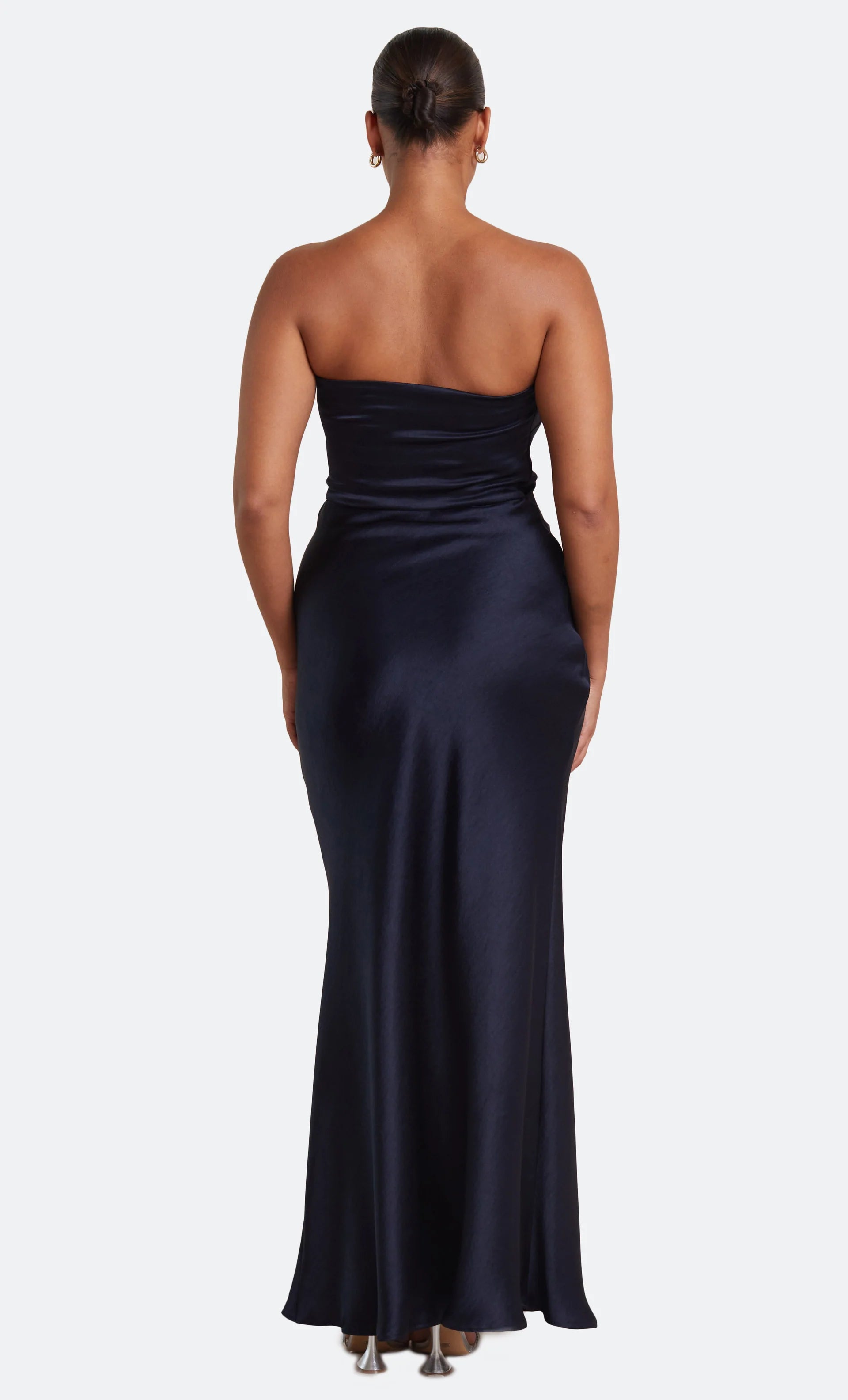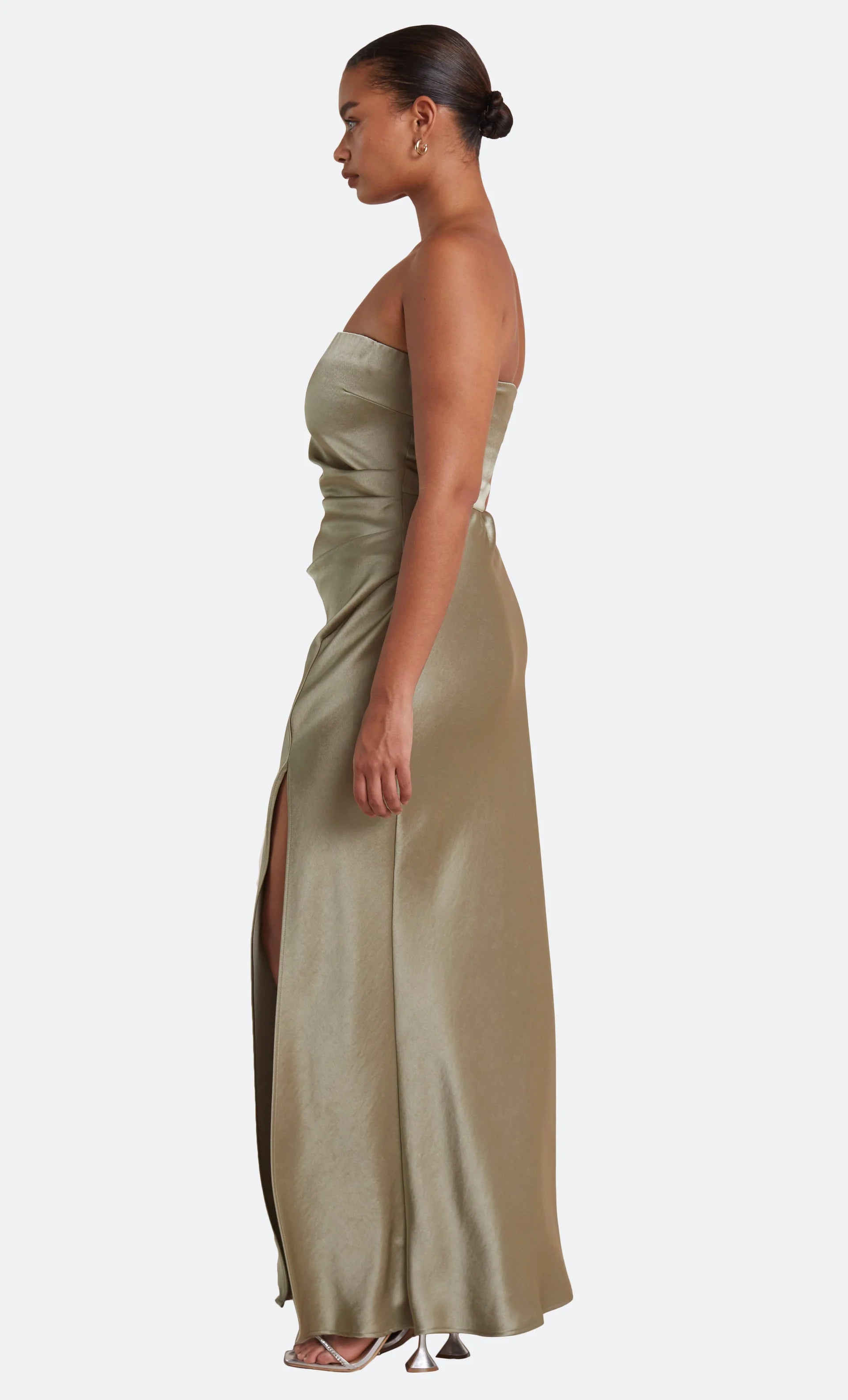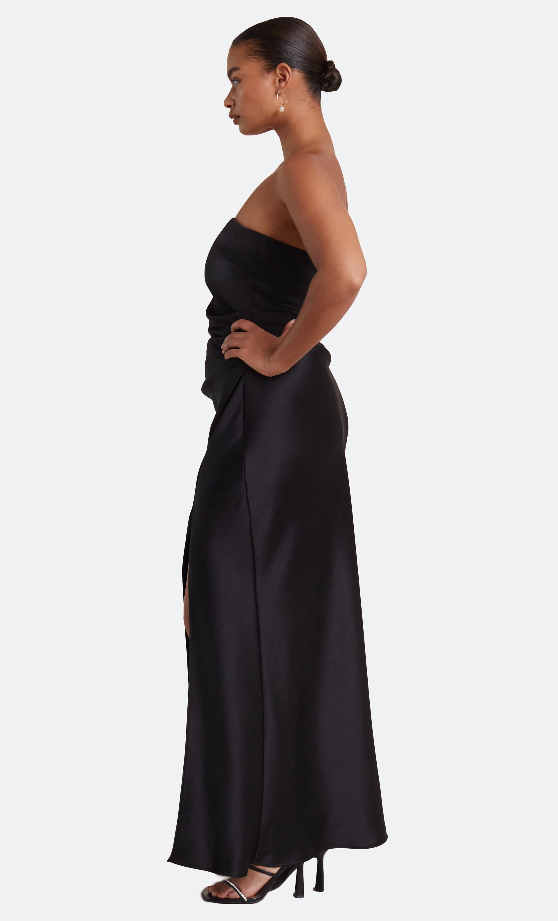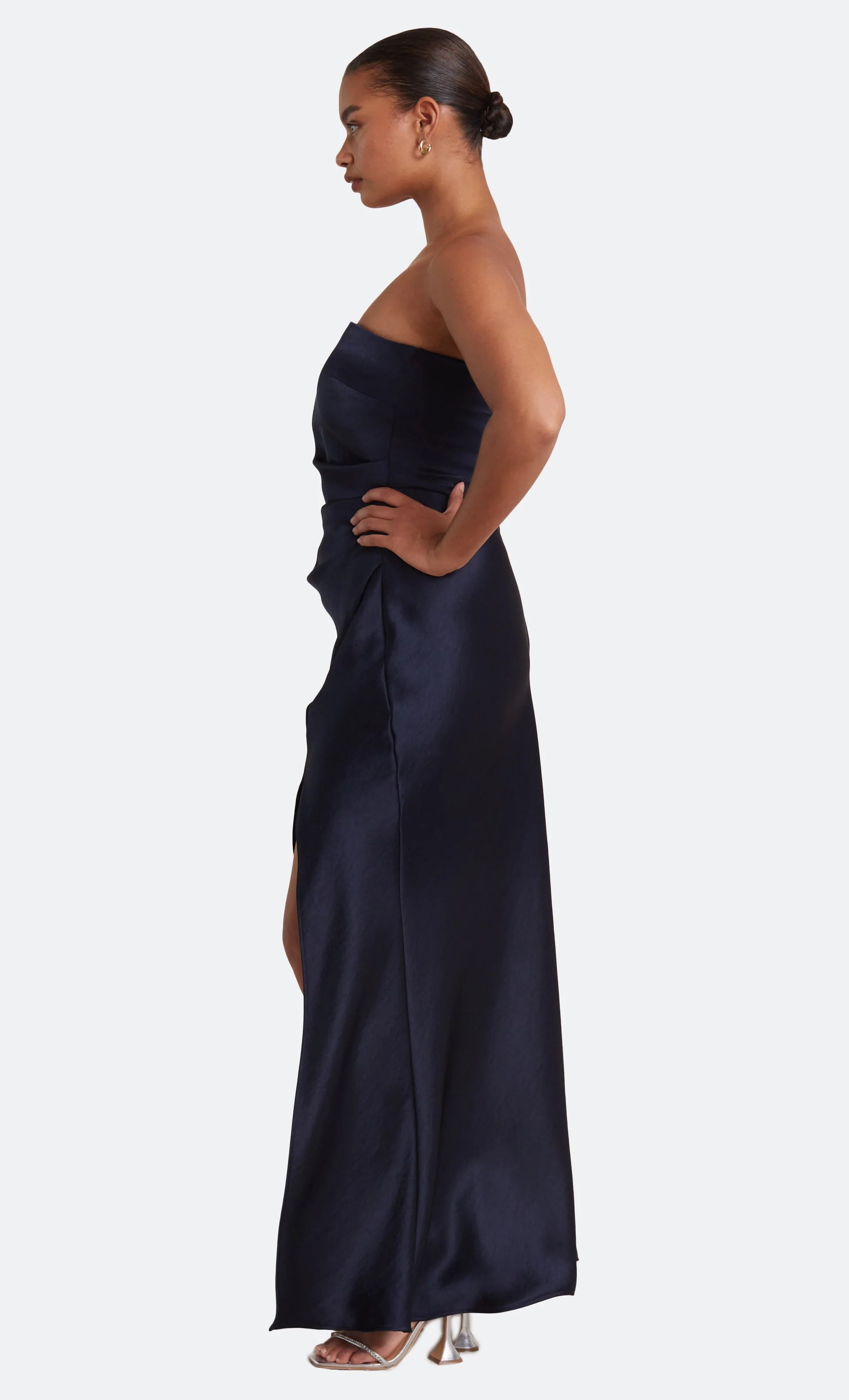 The Dreamer Strapless Dress is a flattering maxi length style with a straight neckline and a statement side leg split. The dress features a gathered effect at the waist and hips to compliment the silhouette and disguises any unwanted lines on the body.